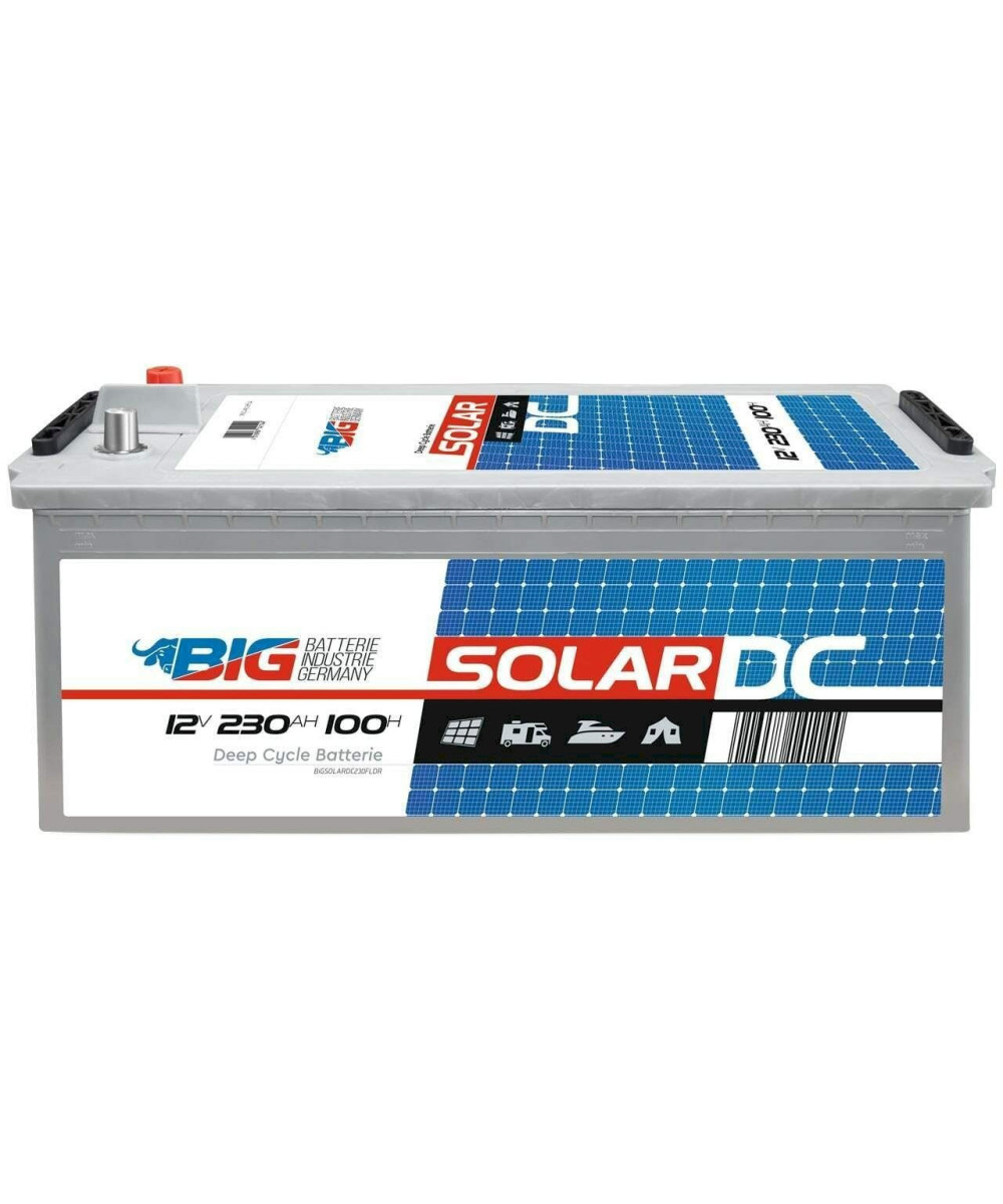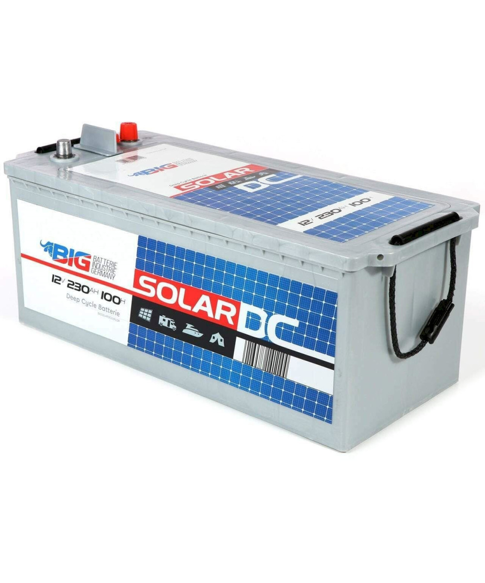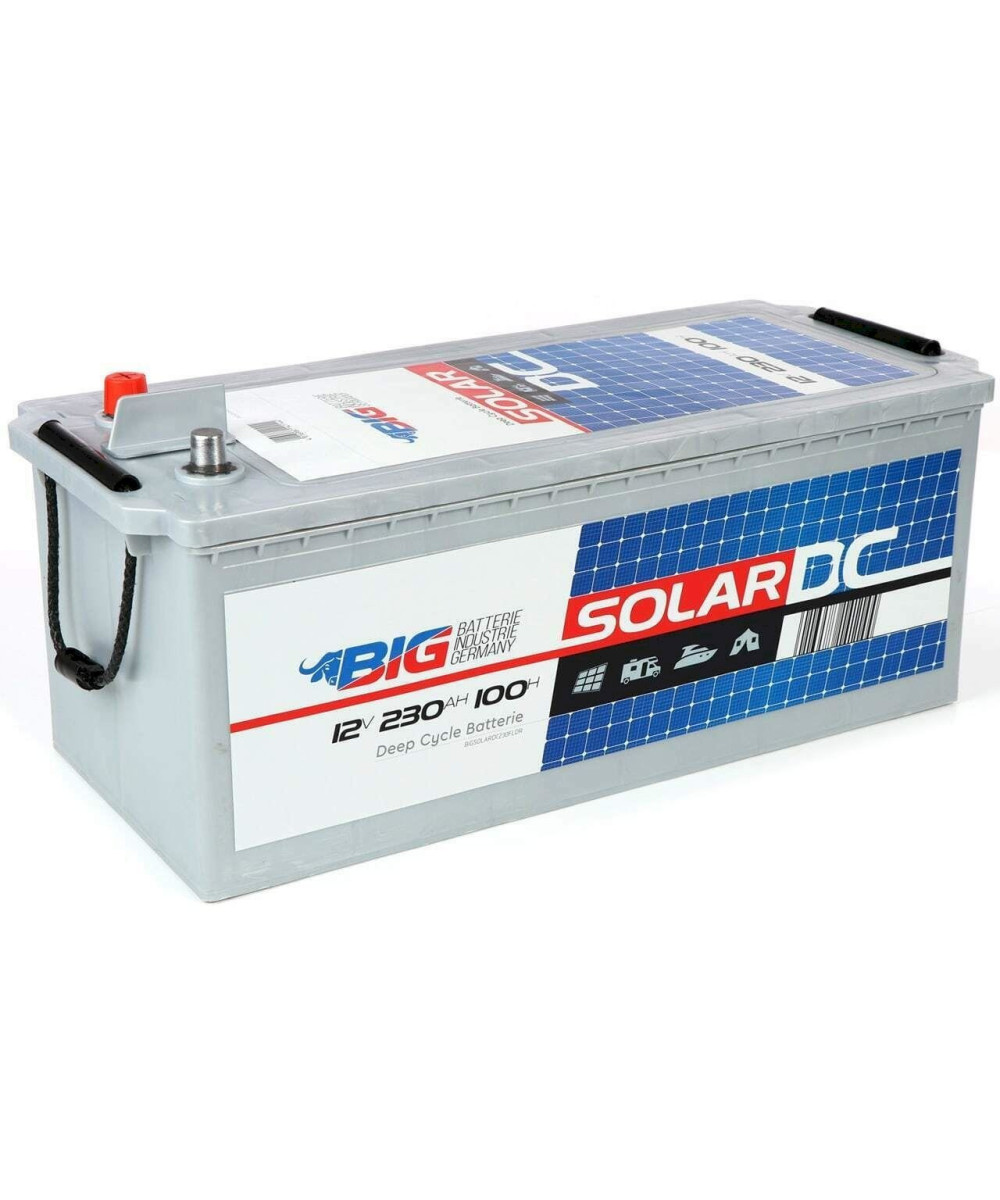 Die BIG Solar 230Ah DeepCycle Säurebatterie wurde speziell für höchste zyklische Beanspruchung entwickelt. Dadurch eignet sie sich hervorragend für den Solar-/Photovoltaieinsatz. Darüber hinaus kann die BIG Solar DC als Verbraucherbatterie in Wohnwagen, Wohnmobilen, Booten, Yachten und Freizeit etc. verwendet werden. Der Einsatz von verstärkten und dicken Bleiplatten machen diese Batterie äußerst langlebig. Die BIG Solar DC ist ein erstklassiges Produkt für hohe Zyklenfestigkeit und zuverlässige Stromversorgung.