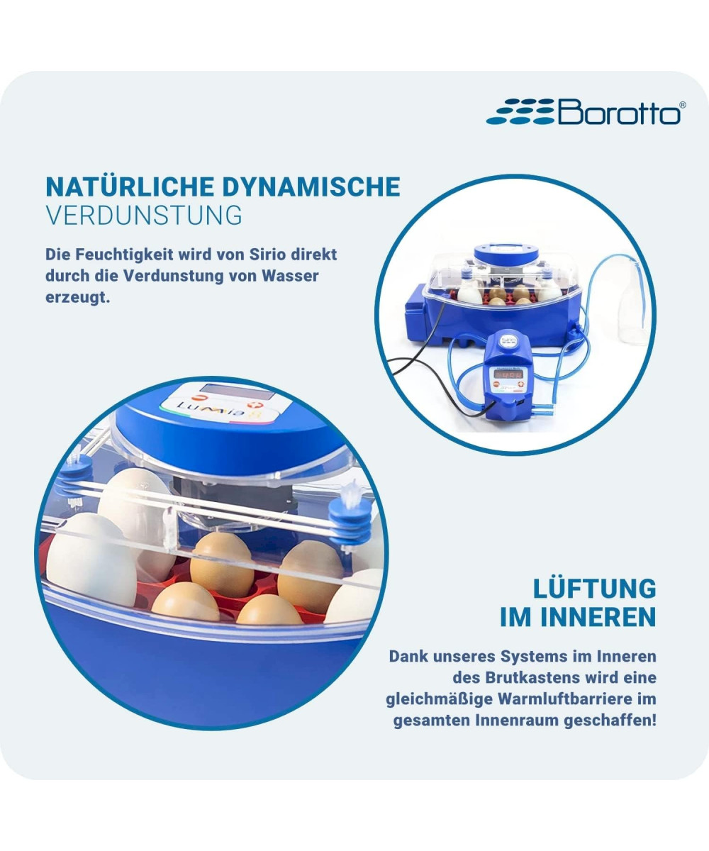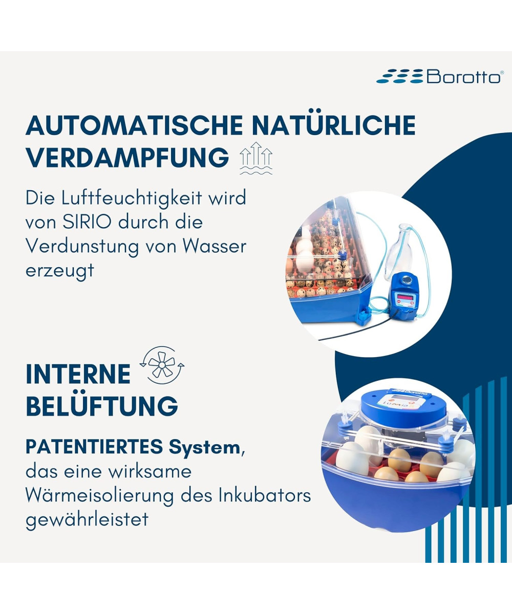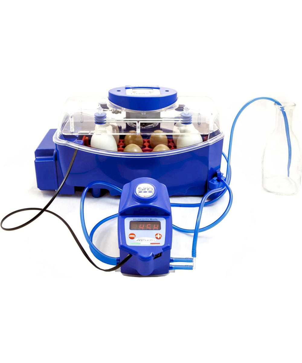Dank SIRIO kann der gewünschte Feuchtigkeitsgehalt über die Tasten auf einem intuitiven LCD-Display eingegeben werden. Danach sorgt SIRIO dafür, Wasser in das Innere der Brutmaschine zu pumpen, um dieses abhängig vom Feuchtigkeitsgehalt in der Umgebung hinzuzufügen und zu stabilisieren und damit die Schlupfrate der inkubierten Eier zu optimieren.