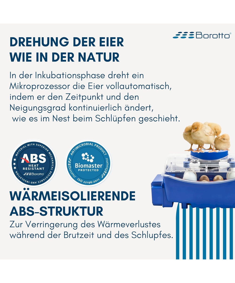HINWEIS: Die vertikale Position der Eier während der Brut entspricht der in den industriellen Brutmaschinen der letzten Generation verwendeten. Sie garantiert stets erheblich höhere Schlupfraten im Vergleich zu den alten Brutgeräten, die nunmehr technologisch überholt sind, in denen die Eier horizontal inkubiert wurden. - PATENTIERTES AUTOMATISCHES BEFEUCHTUNGSSYSTEM