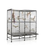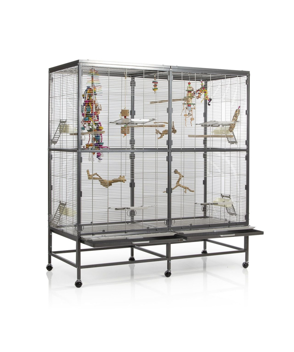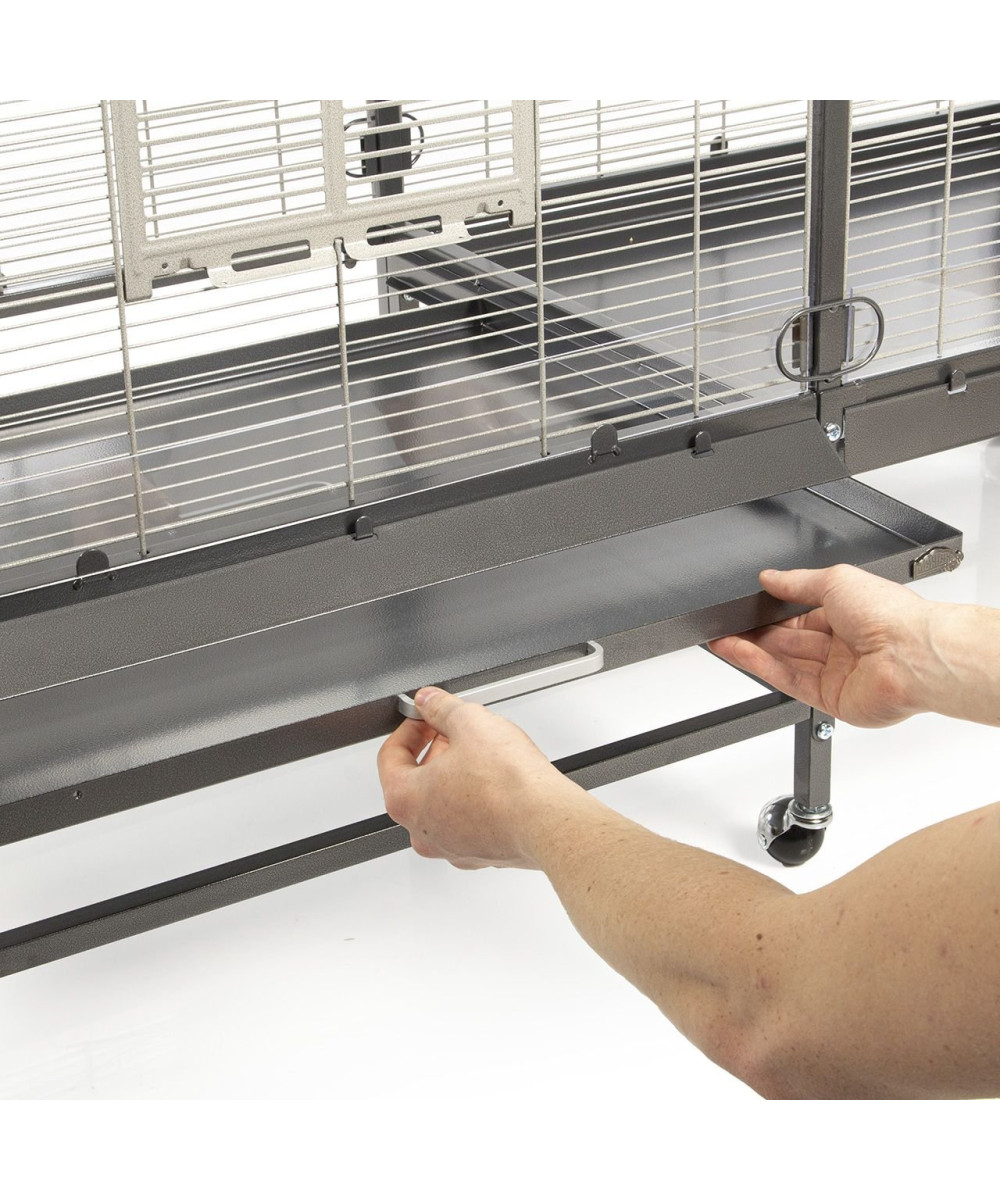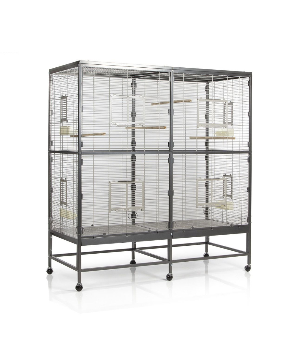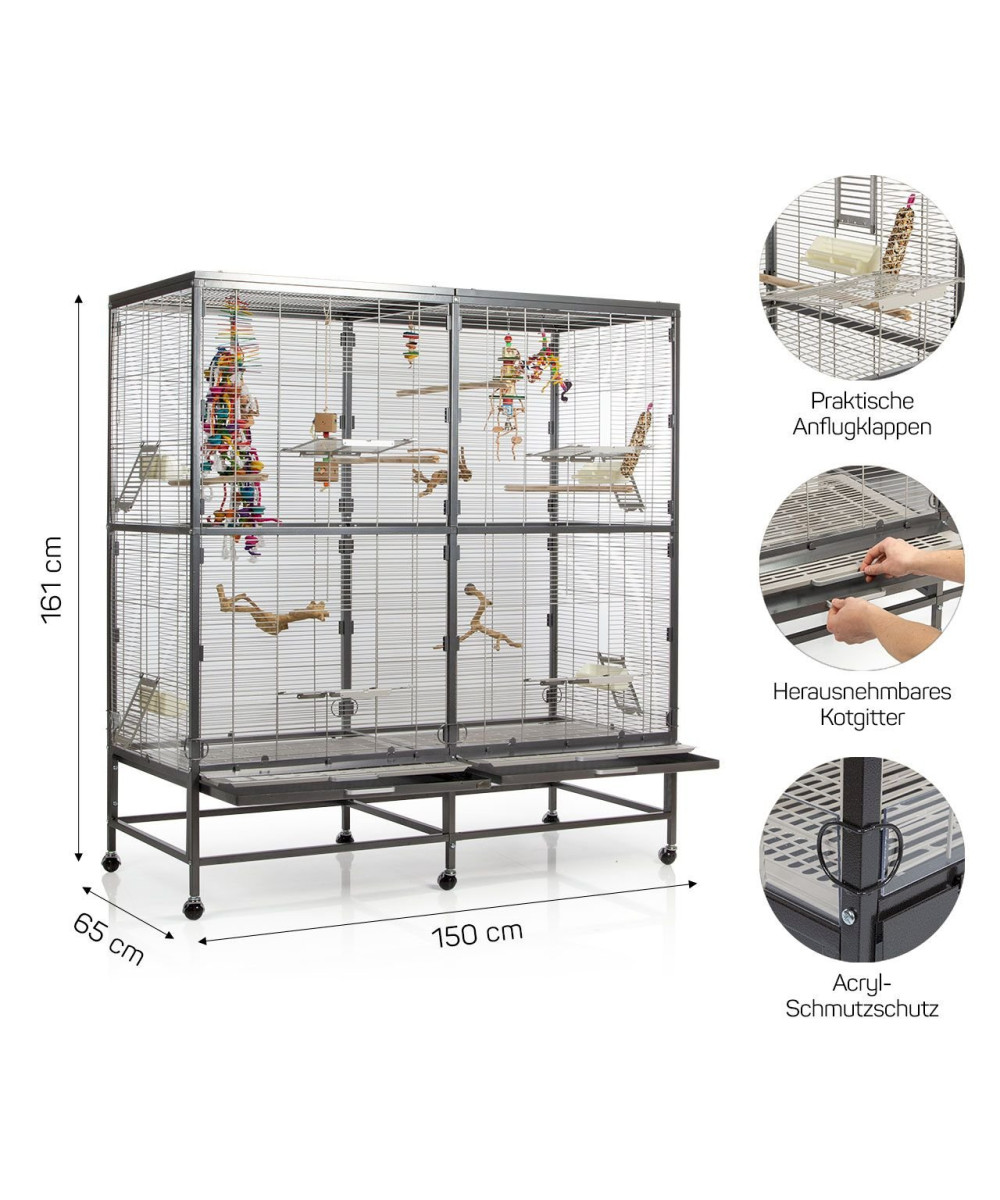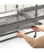 Clevere Details, wie zum Beispiel die Schutzklappe vor der Schublade und der Acryl-Schmutzschutz bieten höchsten Komfort und erleichtern die Reinigung. Die vier Vordertüren lassen sich zu Anflugklappen wandeln, während die vier Seitentürchen zur Anbringung von Nistkasten oder Badehaus dienen. Dank der stabilen, 360° drehbaren Rollenfüße kann die Voliere bei Bedarf ganz einfach den Standort wechseln und bei schönem Wetter auch mal auf die Terrasse oder den Balkon geschoben werden.