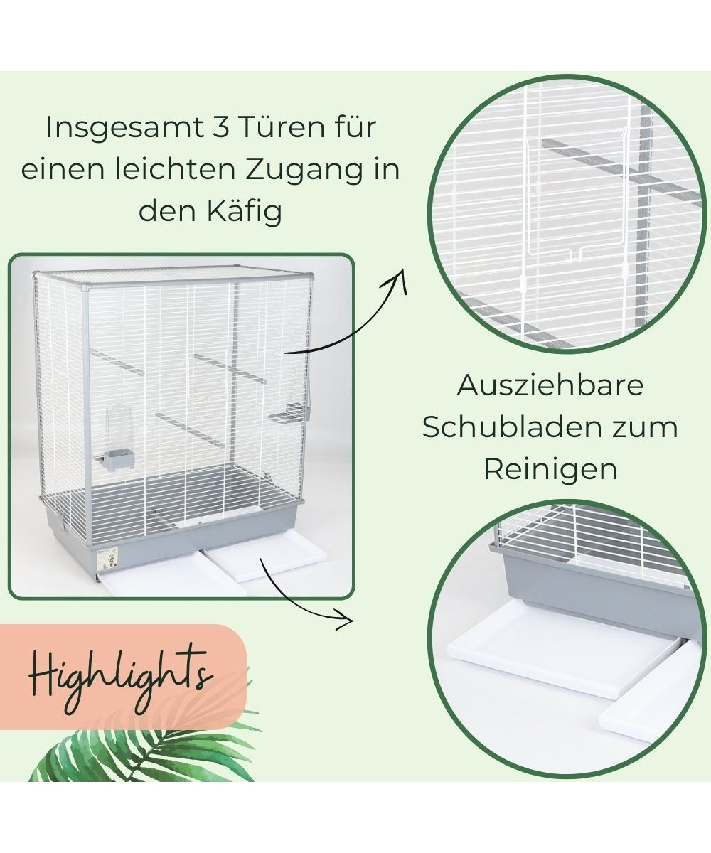 Drei Türen, eine an der Front und je eine links und rechts, ermöglichen leichten Zugang zum Käfiginneren und ermöglicht die Anbringung einer Badewanne.
