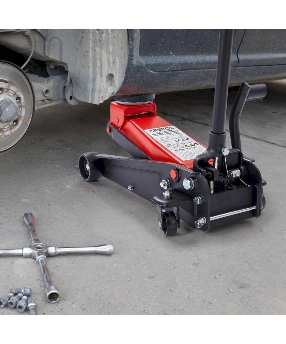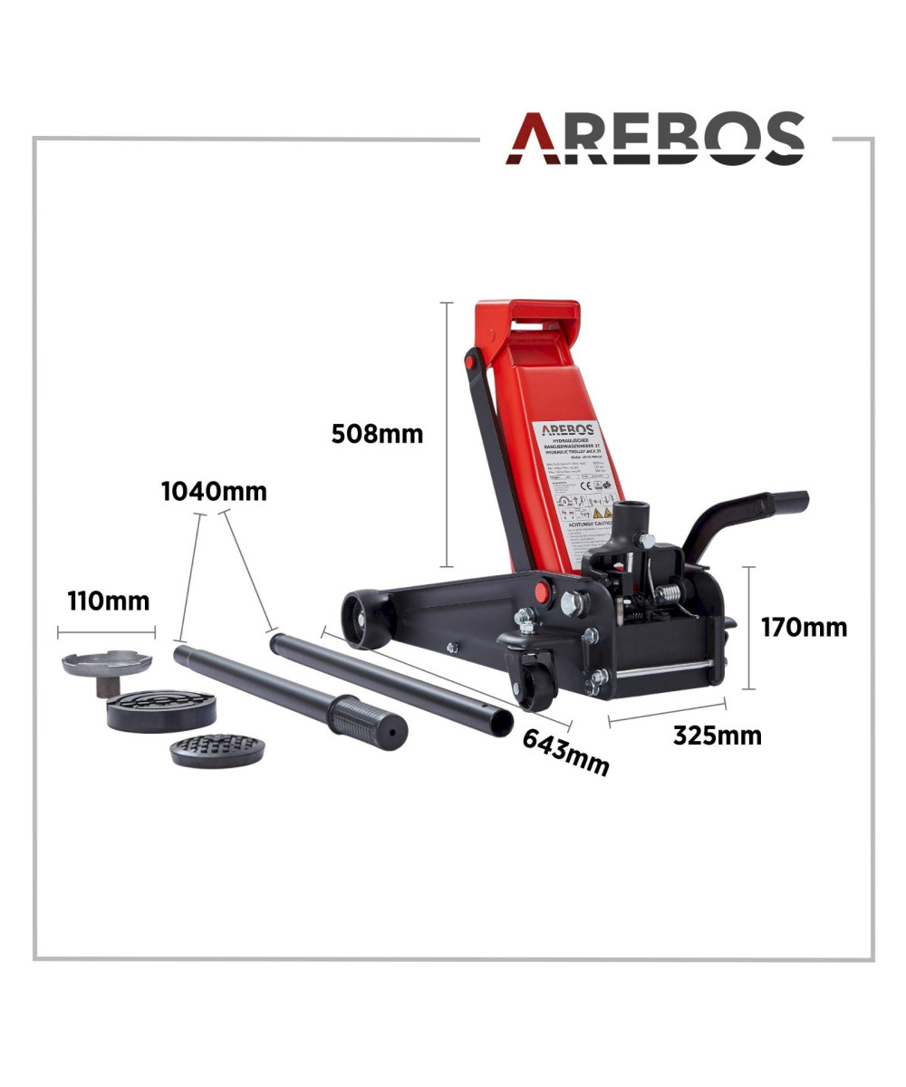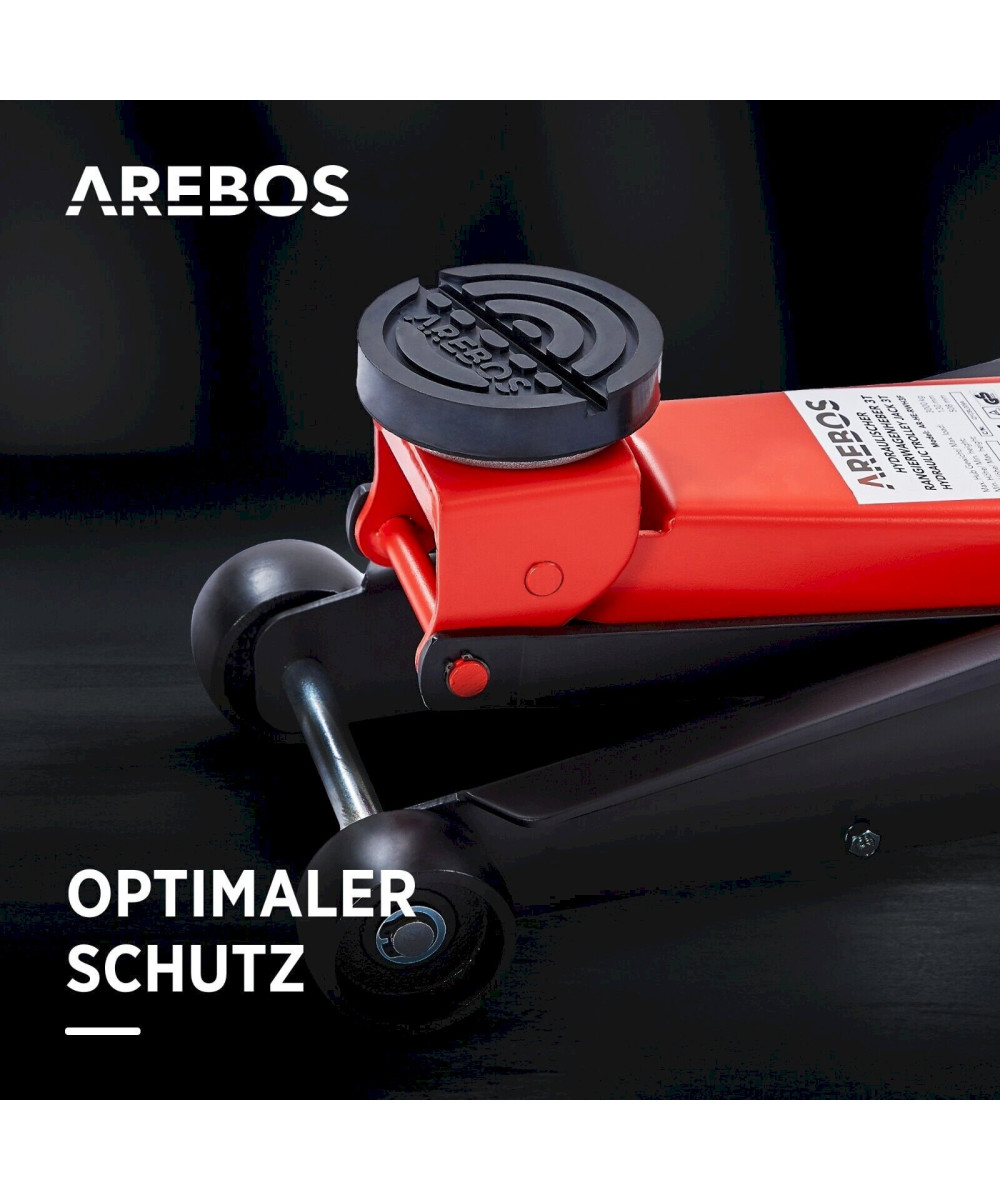 Sie möchten Ihren Reifenwechsel schnell und bequem selbst durchführen? Der robuste AREBOS Hydraulikheber ist ein einfach zu bedienender Rangierwagenheber für Kraftfahrzeuge. Er ist sowohl für den privaten Gebrauch als auch für den Werkstattbereich geeignet. Der Wagenheber beinhaltet eine solide Hydraulikeinheit, die dieses Werkzeug zu einem zuverlässigen Helfer macht.
