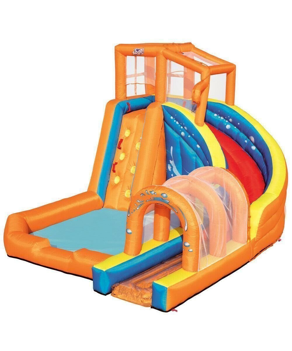 Der H2OGO Hurricane Wasserpark von Bestway sorgt für riesigen Spielspass an heißen Tagen. Der Wasserpark ist mit einer Kletterwand, einem Poolbereich und der großen Wasserrutsche ausgestattet. Der Tunnel, das Sprühduschensystem und das Wasserkissen im unteren Bereich der Rutsche sorgen für den besonderen Wasserspaß.