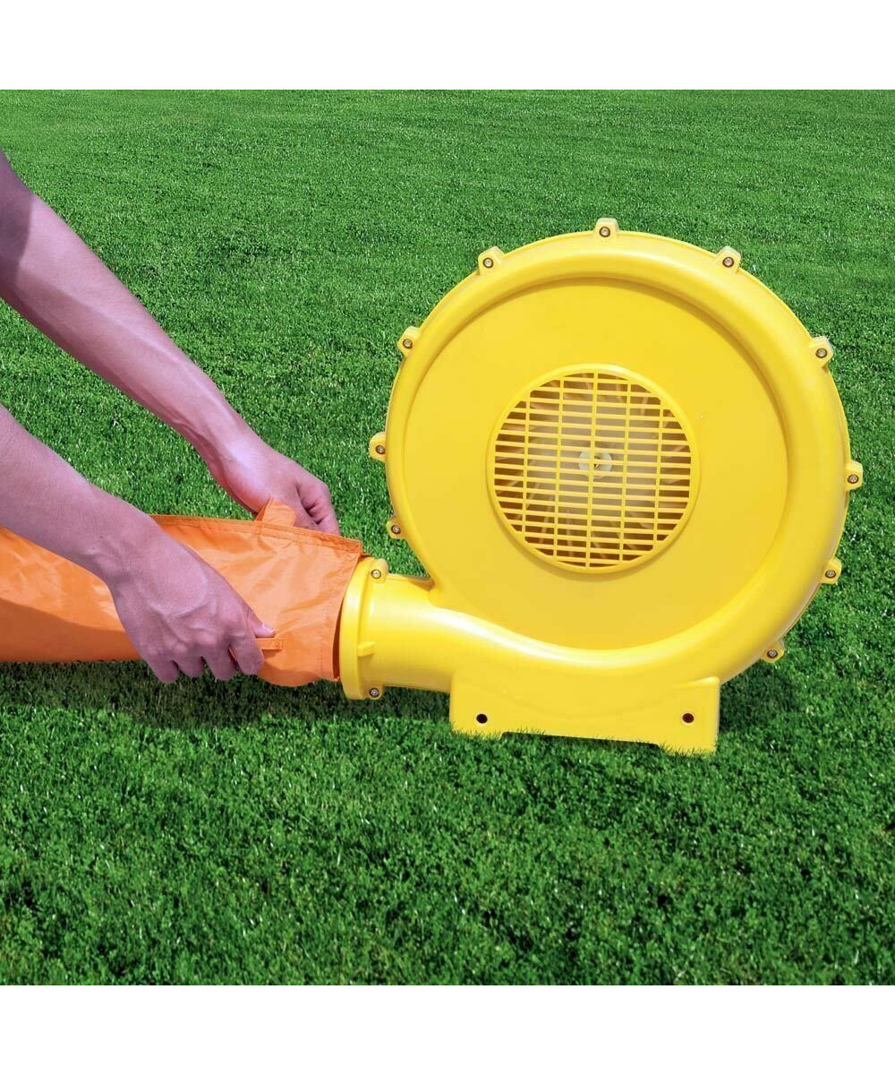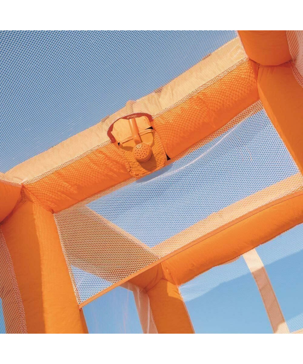 Für die nötige Sicherheit ist der Turm von einem Schutzgitter umgeben. Der Wasserpark besteht aus einem robustem Polyestermaterial mit PVC-Beschichtung. Das leistungsstarke Dauergebläse sorgt für einen schnellen Aufbau.