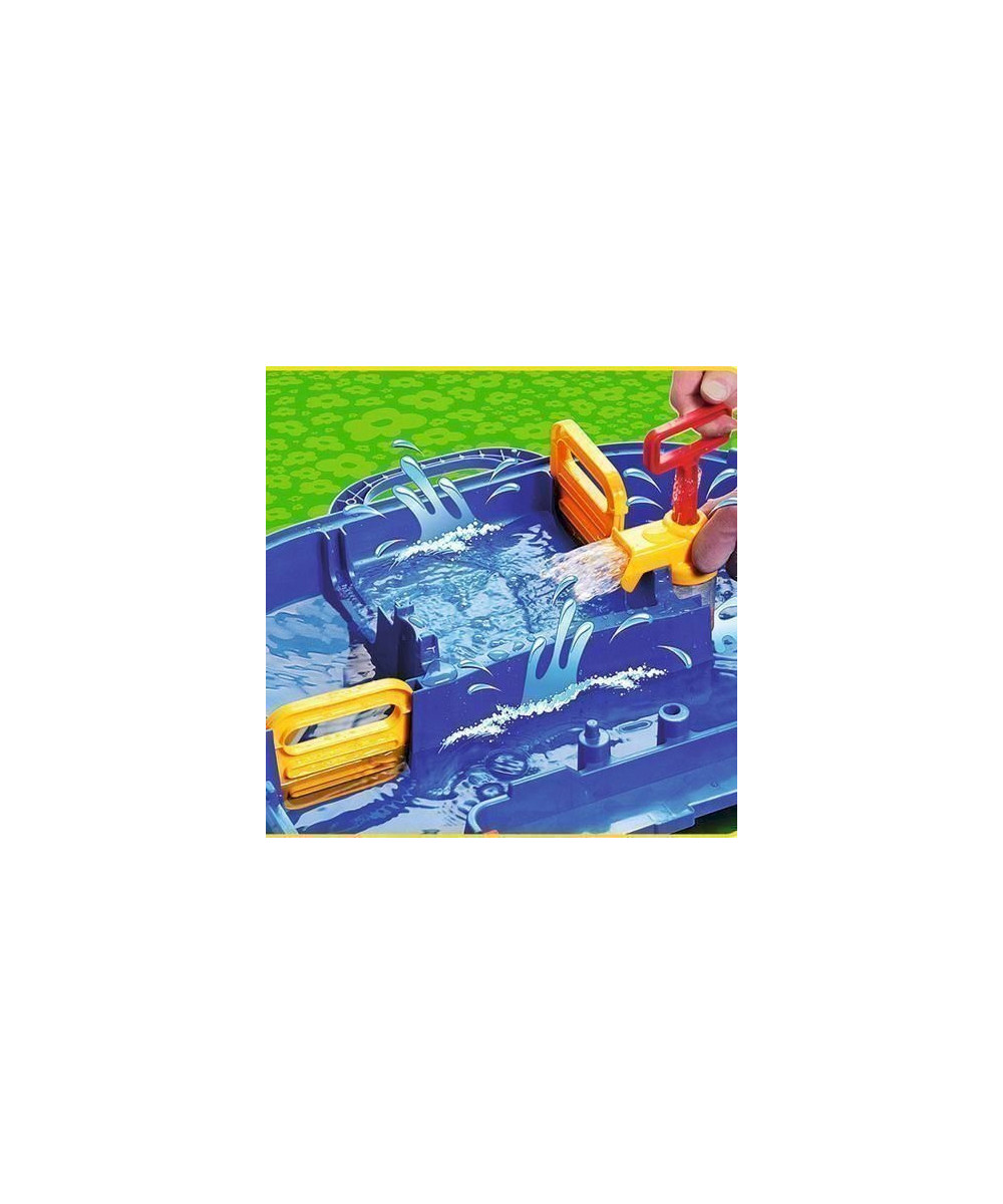 - 32-teiliges Set enthält: Hafenbecken mit Schleuse und Handpumpe, ein Kran mit Container, eine große Brücke mit klappbarem Innenteil, eine Handkurbel mit Paddelflächen, eine kleinere, klappbare Brücke mit Auffahrrampe, ein Fährboot, ein Auto und eine Spielfigur