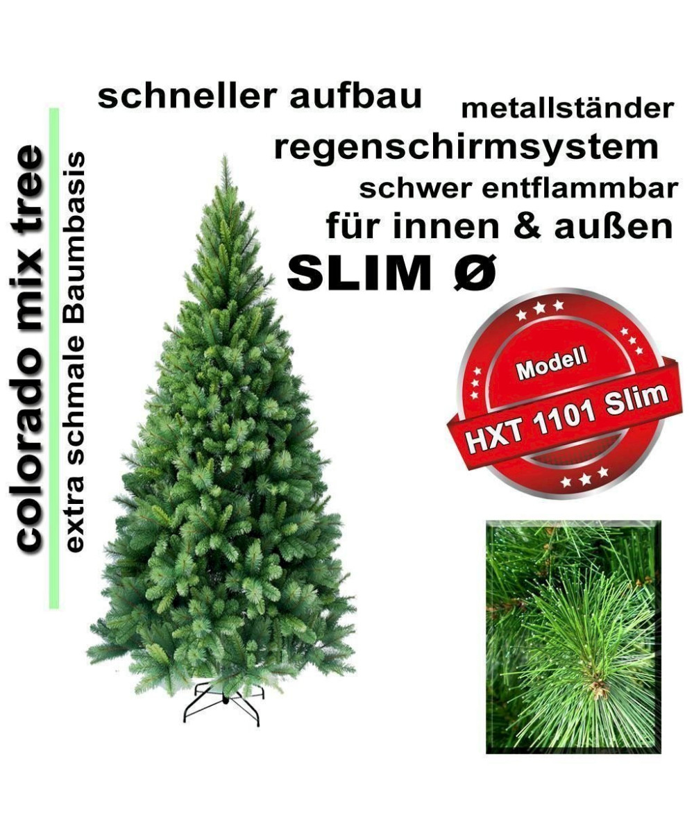 210 cm - EXKLUSIVER künstlicher Weihnachtsbaum der Spitzenklasse. Extra schmaler Durchmesser, bestens geeignet für Dekorationen in Gaststätten und Schaufenstern ( schwer entflammbar )