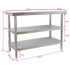 Der Arbeitstisch ist aus rostfreiem Edelstahl gefertigt und äußerst robust. Dadurch eignet sich der Arbeitstisch zum einen für den privaten Hausgebrauch und zum anderen für den professionellen Einsatz in der Gastronomie. Die großzügige Arbeitsfläche ermöglicht ein übersichtliches sowie entspanntes Arbeiten. Zudem ist die Arbeitsfläche einfach zu reinigen, sodass Hygiene garantiert ist. Mit den zwei geräumigen Ablageflächen im unteren Bereich, wurde genügend Stauraum für allerlei Utensilien geschaffen.