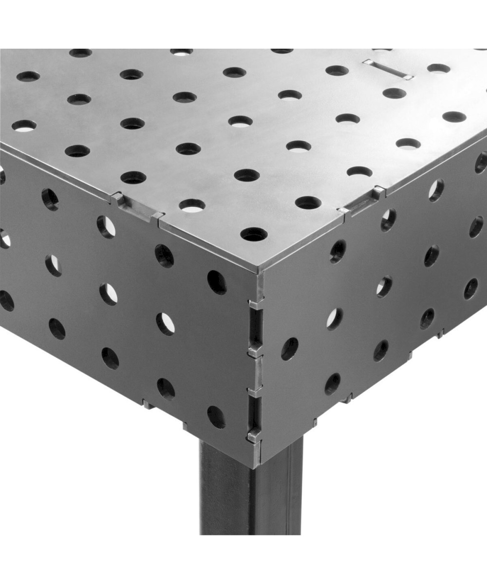 Der STAHLWERK 3D Schweißtisch WT-100 3D ST besitzt dank seiner massiven 6 mm Arbeitsplatte aus hochbelastbarem Carbonstahl hervorragende Stabilitätseigenschaften. Die robuste Oberfläche ist besonders resistent gegen Schläge und Kratzer. Nivellierbare und hochglanzpolierte Edelstahlfüße sowie pulverbeschichtete Tischbeine sorgen für sicheres und komfortables Arbeiten. Der Lochtisch erhält seine besondere Stabilität durch sein hohes Gewicht von mehr als 100 kg und die mit Streben verstärkte Arbeitsplatte. Somit ist er für alle Schweißverfahren und zahlreiche andere Werkstattprojekte geeignet. Dank der vorgefertigten Löcher mit einem Durchmesser von 16 mm lassen sich Spannelemente und Fixierhilfen problemlos befestigen. Aufbau und Ausrichtung der für das Schweißen benötigten Werkstücke werden so vereinfacht und zusätzliche Werkzeuge, wie beispielsweise Winkel, nicht benötigt. Durch die praktische 3D-Konstruktion können Spannelemente und Fixierhilfen nicht nur auf der Arbeitsplatte, sondern auch an den Seiten des Tisches befestigt werden, was sowohl ein horizontales als auch ein vertikales Arbeiten ermöglicht. Mit einer Tragkraft von bis zu 1.000 kg eignet sich der Schweißtisch für den professionellen Einsatz in Industrie, Handwerk und DIY.