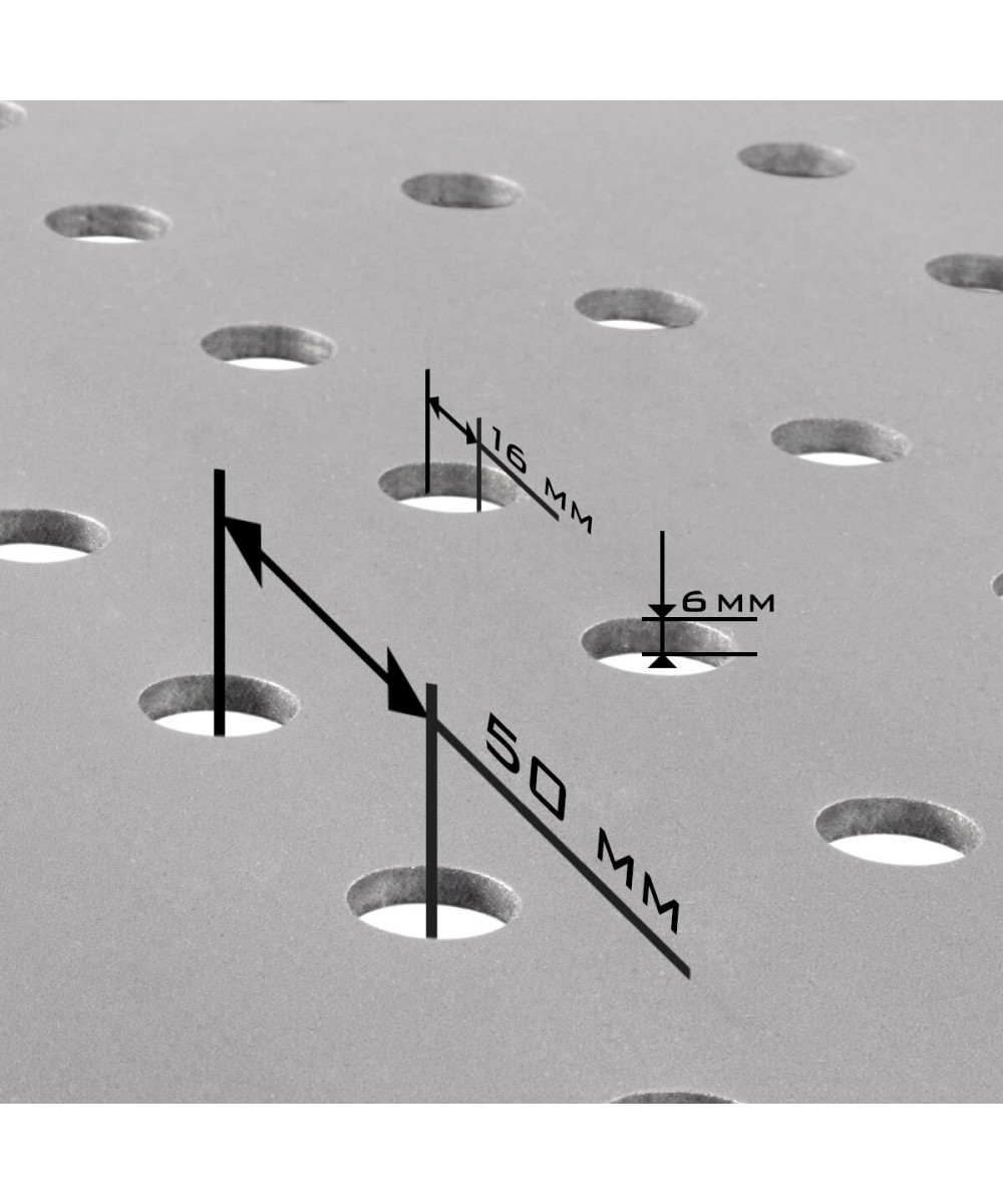 - Dank der vorgefertigten Löcher mit einem Durchmesser von 16 mm lassen sich Spannelemente und Fixierhilfen problemlos befestigen. Aufbau und Ausrichtung der Werkstücke werden so vereinfacht und zusätzliche Werkzeuge, wie beispielsweise Winkel, nicht benötigt.