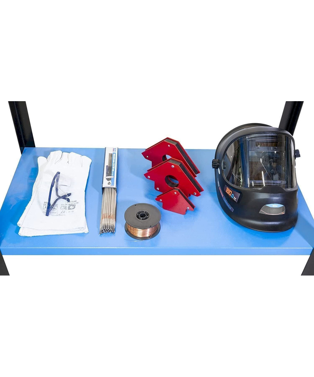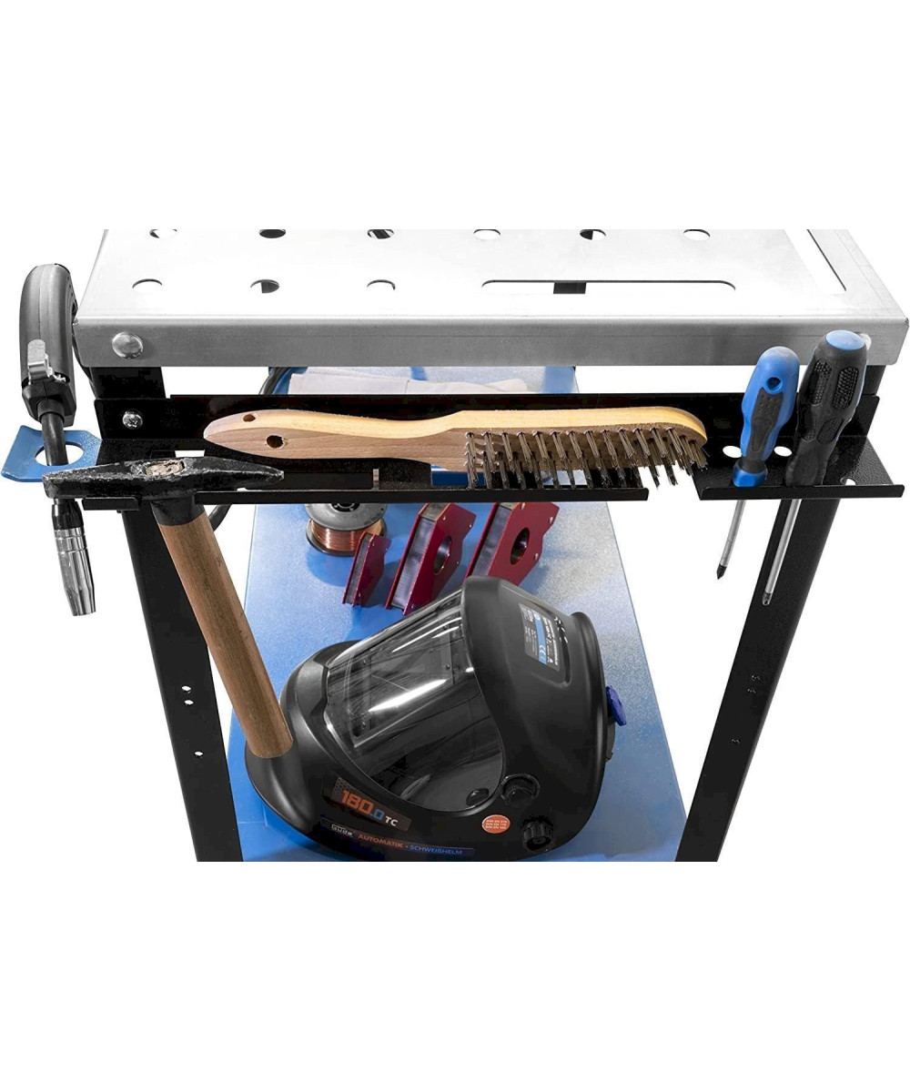 Praktischer, verzinkter Schweißtisch von Güde für den mobilen Einsatz in Werkstatt und Garage. Stabile, lasergeschnitte Tischfläche, mit 16mm-Löchern für Schweißklemmen zu sicheren Fixierung des Schweißgutes. Mit Langlöchern zur Bestigung von Schraubstöcken und Winkelklemmen. 4 Lenkrollen mit Feststellbremse sorgen für größmögliche Mobilität und absolut sicheren Stand. Mit Schweißgerätekonsole und Elektrodenhalter bzw Brennerhalter sowie Werkzeugleiste, zur sicheren Aufbewahrung aller relevanten Teile. Das großzügige Ablagefach unter dem Tisch bietet genügend Platz für wichtiges Zubehör und sorgt für Ordnung und Übersicht. Das 4-teilige Schweißmagneten Set ermöglicht ein sicheres Positionieren und Fixieren beim Heften des Schweißgutes. Mit 300kg Traglast auch für schwere Werkstücke problemlos geeignet.