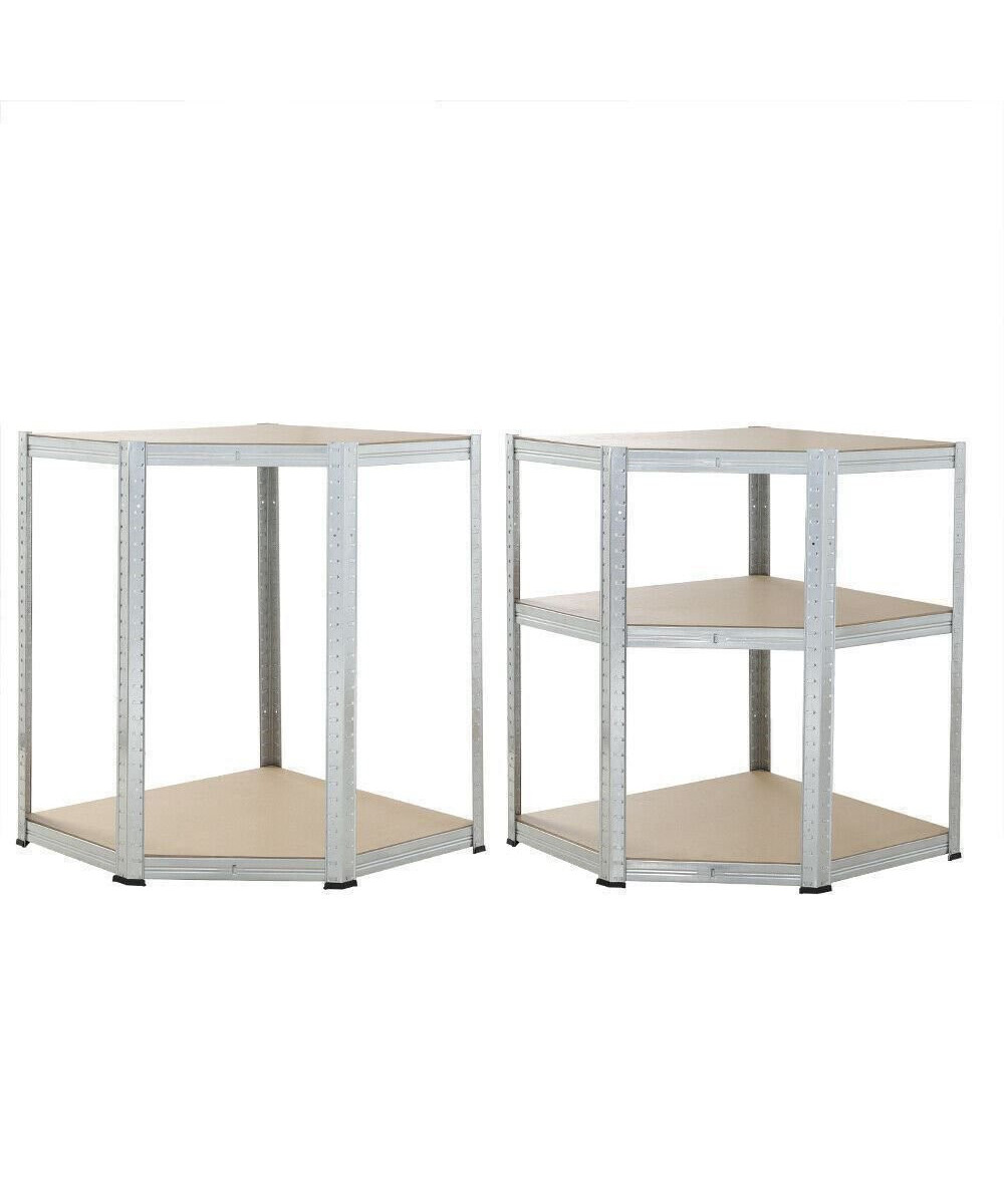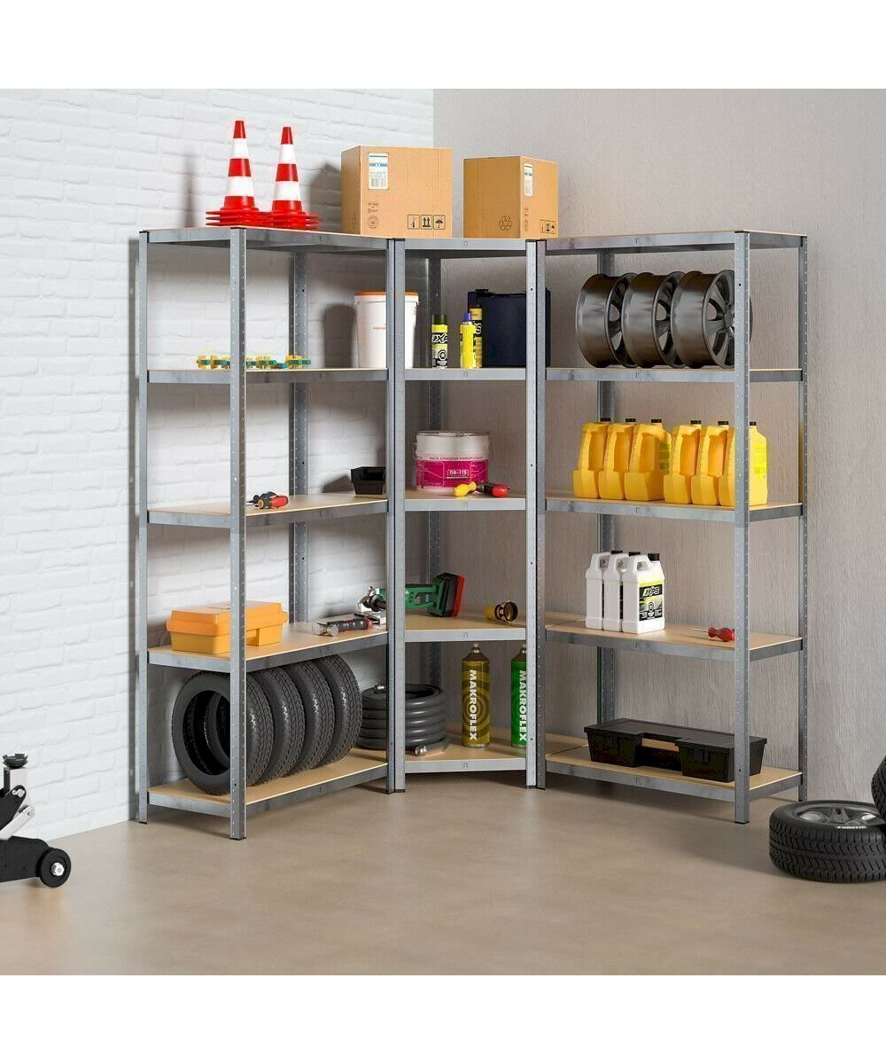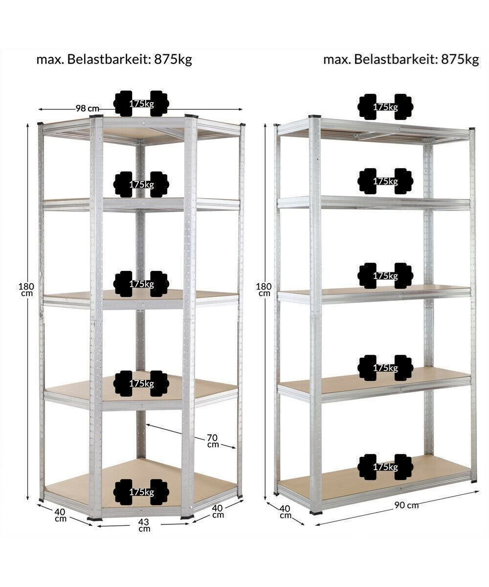 Mit diesem Regal-Set der Marke monzana® nutzen Sie Ecken optimal aus. Das Lagerregal besteht aus hochwertig verzinktem Stahl. Die Streben der Einlegeböden sorgen für hohe Stabilität. Jedes Regal hat eine Gesamttragkraft von 875kg. Die Gummischoner an den Standbeinen verhindern Kratzer auf Fußböden und Decken.