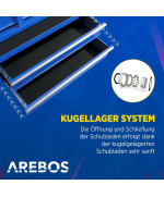 Der AREBOS Werkstattwagen ist aus robustem Stahl gefertigt. In den ausziehbaren Schubladen können Sie Ihr Werkzeug optimal sortieren. Die Öffnung und Schließung erfolgt dank der kugelgelagerten Schubladen sanft. Sie besitzen eine Einrastfunktion, sodass sie sich nicht von selbst öffnen. Antirutschmatten sorgen dafür, dass das Werkzeug an seinem Platz bleibt.