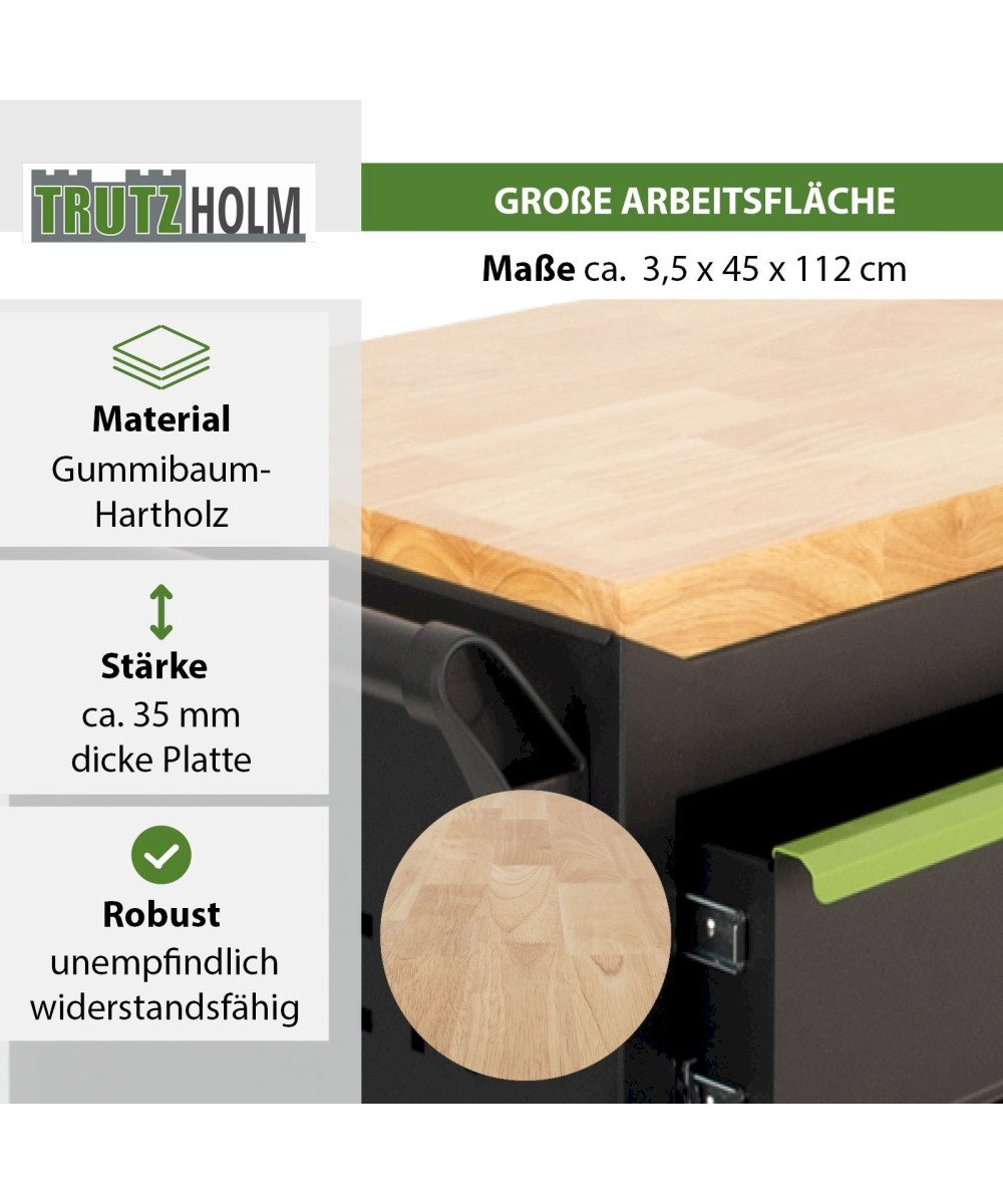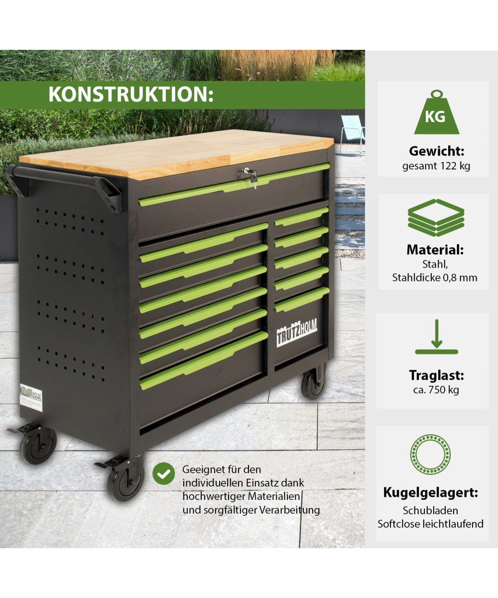 Dieser vielseitige Werkstattwagen besticht durch sein edles schmales Design und seine robuste Qualität, die ihn nicht nur in der Werkstatt, sondern auch als stilvolles Möbelstück in Loftwohnungen oder auf Terrassen zum Blickfang macht. Der in schwarz gehaltene Korpus mit maserierter Oberfläche wird durch grüne, glatt pulverlackierte Grifffronten akzentuiert und verleiht dem Wagen eine moderne, hochwertige Optik. Gefertigt aus 0,08 mm starkem Stahl und ausgestattet mit einer stabilen Arbeitsplatte aus matt lackiertem Gummibaum-Hartholz, kombiniert der Werkstattwagen Funktionalität mit stilvollem Design. Die großzügige Arbeitsplatte misst 112 x 45 x 3,5 cm und bietet ausreichend Platz für unterschiedlichste Arbeiten. Mit einer Gesamthöhe von 103 cm und den Abmessungen des Korpus von 112 x 45 x 88 cm fügt sich der Wagen harmonisch in verschiedenste Raumkonzepte ein. Er ist mit vier 12,5 cm großen Rädern ausgestattet, von denen zwei beweglich und mit Feststellbremsen versehen sind, um ein sicheres und flexibles Arbeiten zu ermöglichen. Die 12 Schubladen bieten reichlich Stauraum für Werkzeuge und Utensilien. Die Anordnung umfasst eine großzügige obere Schublade (92,5 x 40,0 x 12 cm), fünf kleine Schubladen (29,0 x 40,0 x 6,0 cm), fünf mittelgroße Schubladen (56,5 x 40,0 x 6,0 cm) sowie zwei große Schubladen (56,5 x 40,0 x 14 cm), die sich ideal für größere Gegenstände eignen. Zusätzlich befinden sich an den Seiten Lochwände (280 x 510 mm) zur individuellen Erweiterung des Stauraums.