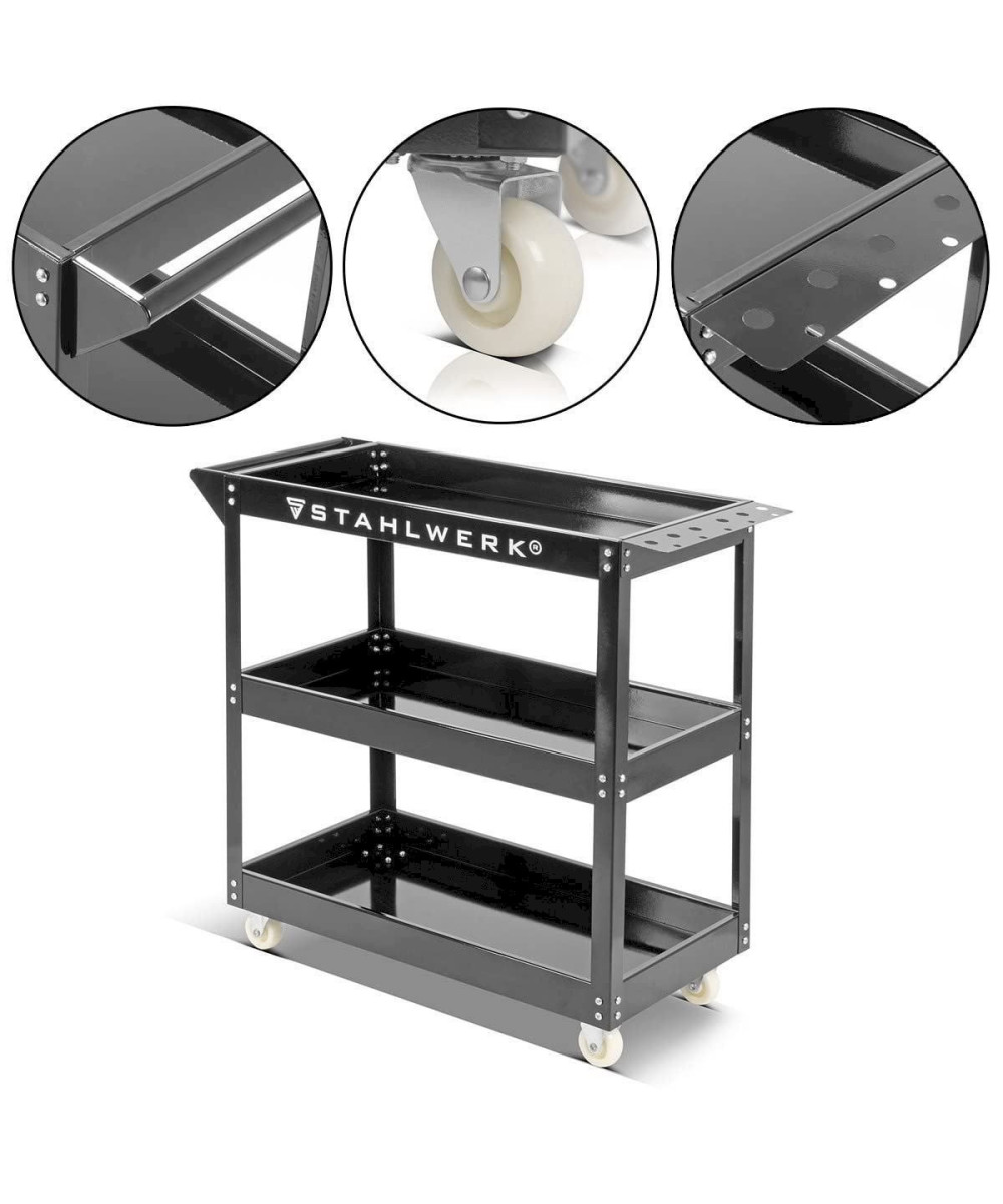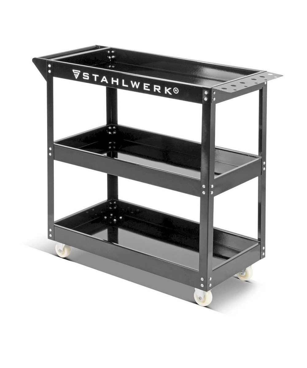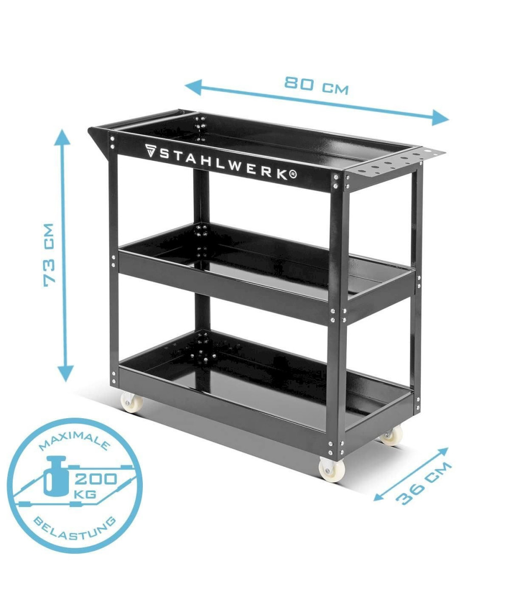- Der STAHLWERK Werkstatt Rollwagen ist mit 3 geräumigen Ladeflächen ausgestattet und garantiert somit viel Raum für große und kleine Werkzeuge. Er kann insgesamt mit bis zu 200 kg belastet werden.