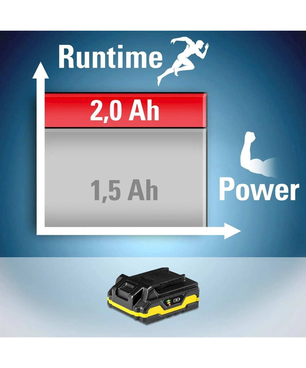 Ein Akku mit einer Kapazität von 2,0 Ah gewährt eine bis zu 33% längere Nutzung des Gerätes gegenüber eines 1,5 Ah-Akkus.