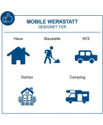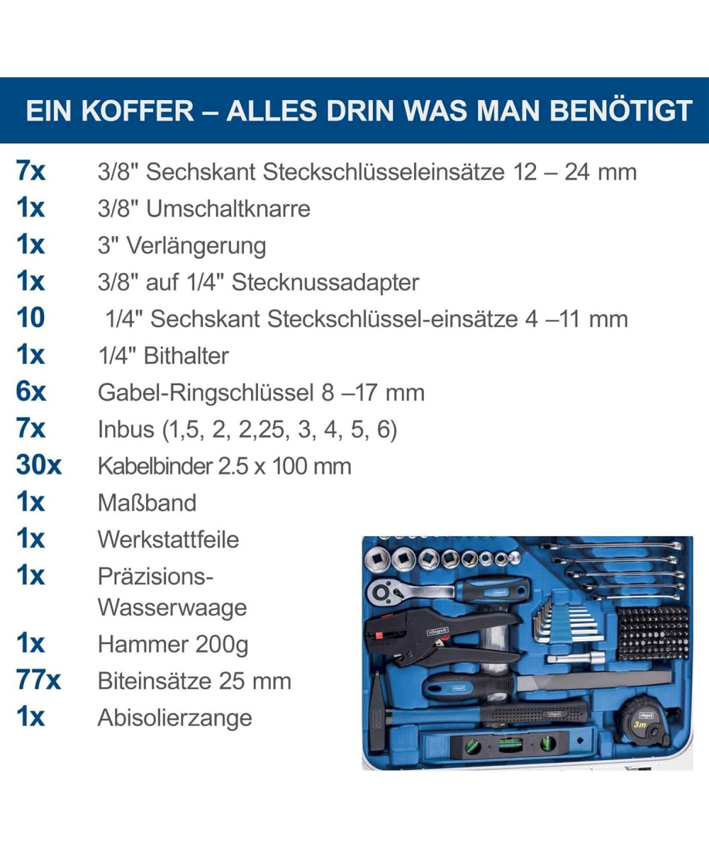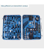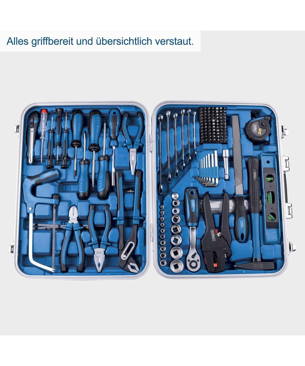 Der Scheppach Werkzeugkoffer TB173 enthält ein umfangreiches 174-teiliges Werkzeug-Set für den vielseitigen Einsatz rund um Haushalt, Baustelle, Werkstatt oder beim Camping. Die Werkzeuge sind aus hochwertigem, langlebigem Chrom-Vanadium-Stahl gefertigt. Das gut sortierte Werkzeug-Set wird in einem robusten und abschließbaren Kunststoffkoffer geliefert, der mit verstärkten Ecken auch für härtere Einsatzbedingungen sowie den mobilen Einsatz bestens geeignet ist. Enthalten sind unter anderem verschiedene Steckschlüsseleinsätze, diverse Biteinsätze, ein Inbusset und vieles mehr.