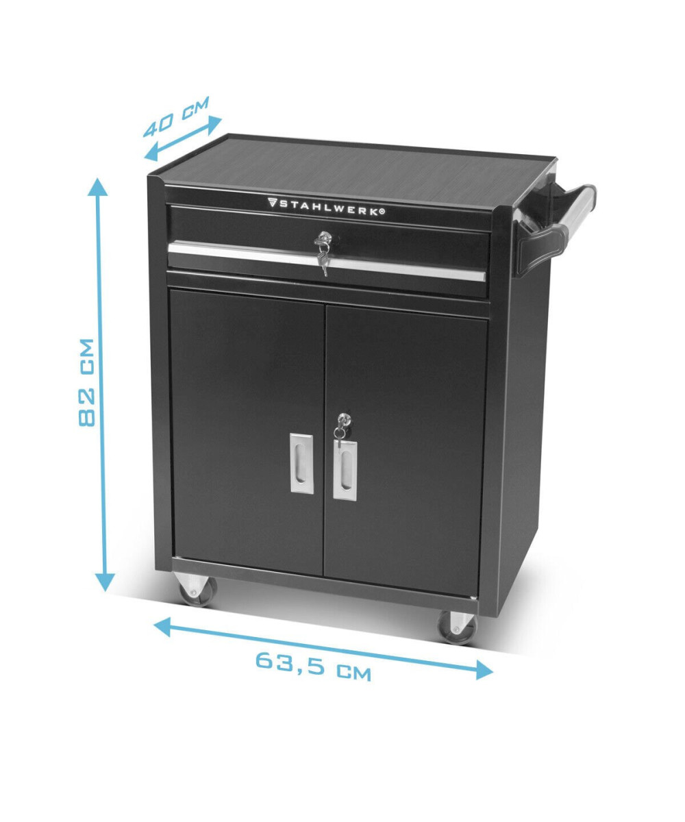 Der STAHLWERK Werkzeugschrank bietet viel Stauraum für Werkzeug und anderes Werkstattzubehör. Ausgestattet mit einem Regalboden und einer Schublade ermöglicht der Werkstattschrank eine optimale Organisation und den perfekten Überblick über alle Werkzeuge. Sowohl die Schranktüren, als auch die Schublade des Metallschranks sind abschließbar, damit der Inhalt vor unbefugtem Zugriff geschützt werden kann. Die Schublade besitzt eine praktische Metallleiste über die ganze Länge und ist mit bis zu 25 kg belastbar. Auf der Anti-Rutschmatte lassen sich Werkzeuge sicher ablegen. Der Werkstattwagen verfügt über zwei feste und zwei lenkbare, stabile Rollen sowie einen Schiebegriff, dank dem er leicht und schnell zum Einsatzort bewegt werden kann. Seine stabile Bauweise aus massivem Stahl schützt den Werkzeugschrank vor schnellem Verschleiß und garantiert hohe Belastbarkeit. Hochwertig verarbeitet eignet sich der Werkzeugwagen für den professionellen Einsatz in Industrie, Handwerk, Gewerbe und DIY.