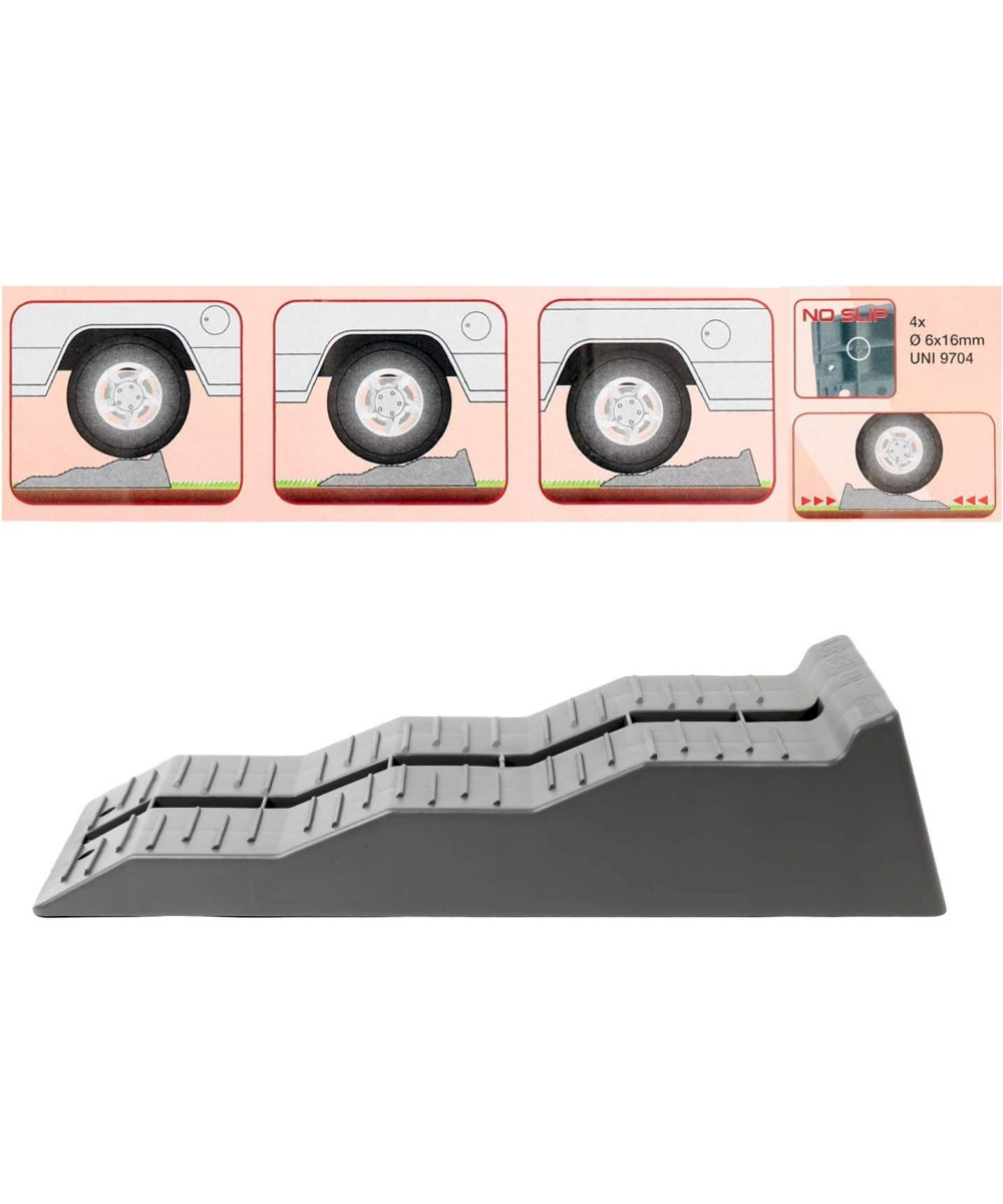 Das extrem widerstandsfähige Nivelliersystem Level Up von Fiamma sorgt für mehr Tragkraft und Stabilität. Die Stufenkeile sind bestens für sowohl harten als auch weichen Untergrund geeignet. Die breite, rutschsichere Auffahrfläche in verschiedenen Höhen – Niveaus (4 – 7 – 10 cm) bietet sicheren Halt. Die robuste Materialzusammensetzung sorgt für geringe Verschleißerscheinungen trotz häufiger Nutzung. Auch Schräglagen auf dem Stellplatz gleichen die Keile zuverlässig aus. Dabei sind sie durche ihre Treppenform nicht zu steil und unterstützen ein leichteres Auffahren. Die vergleichsweise große Auflagefläche auf dem Boden ist besonders auf feuchtem Gelände von Vorteil und besonders standsicher.