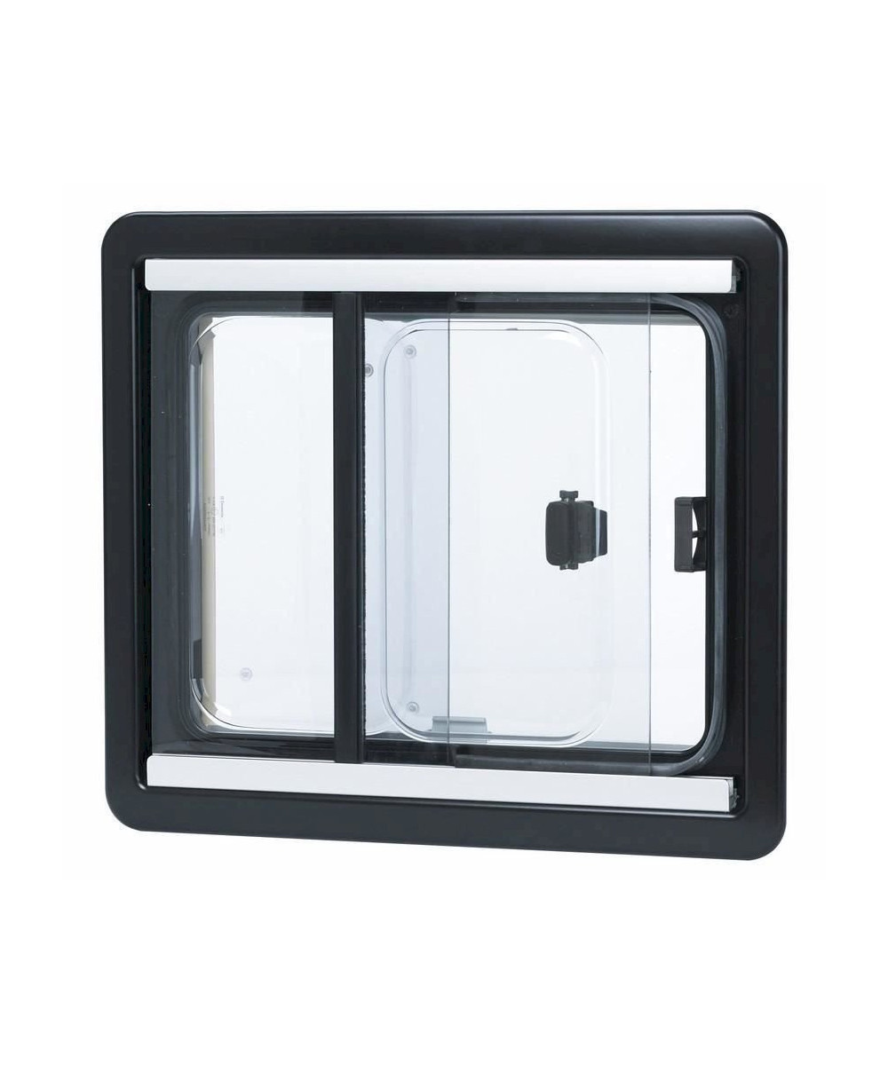 Die vordere Scheibe (in Fahrtrichtung gesehen) ist verschiebbar, die hintere Scheibe ist fest und verfügt über eine integrierte, aluminiumbeschichtete Verdunkelungsblende und ein Fliegengitter. Ein sicheres Verschlusssystem sorgt dafür, dass es nicht von außen geöffnet werden kann. Das Fliegengitter und die Verdunkelungsblende halten Insekten fern und sorgen für mehr Privatsphäre. Die doppelte Acrylverglasung der Fensterscheibe und der solide Rahmen aus Polyurethan gewährleisten eine ausgezeichnete Isolierung.