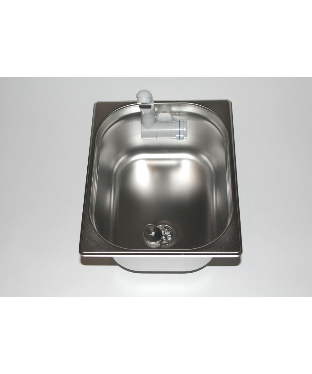 Ablaufgarnitur mit 19 mm Ø Anschluss. Edelstahl Spülbecken. Material : Edelstahl. mit Integriertem Wasserhahn Barwig Grau. Automatik Wasserhahn mit Schalter. ca. 30 cm Kabel. Individuelles Einsetzen in die Arbeitsplatte der Küche möglich.