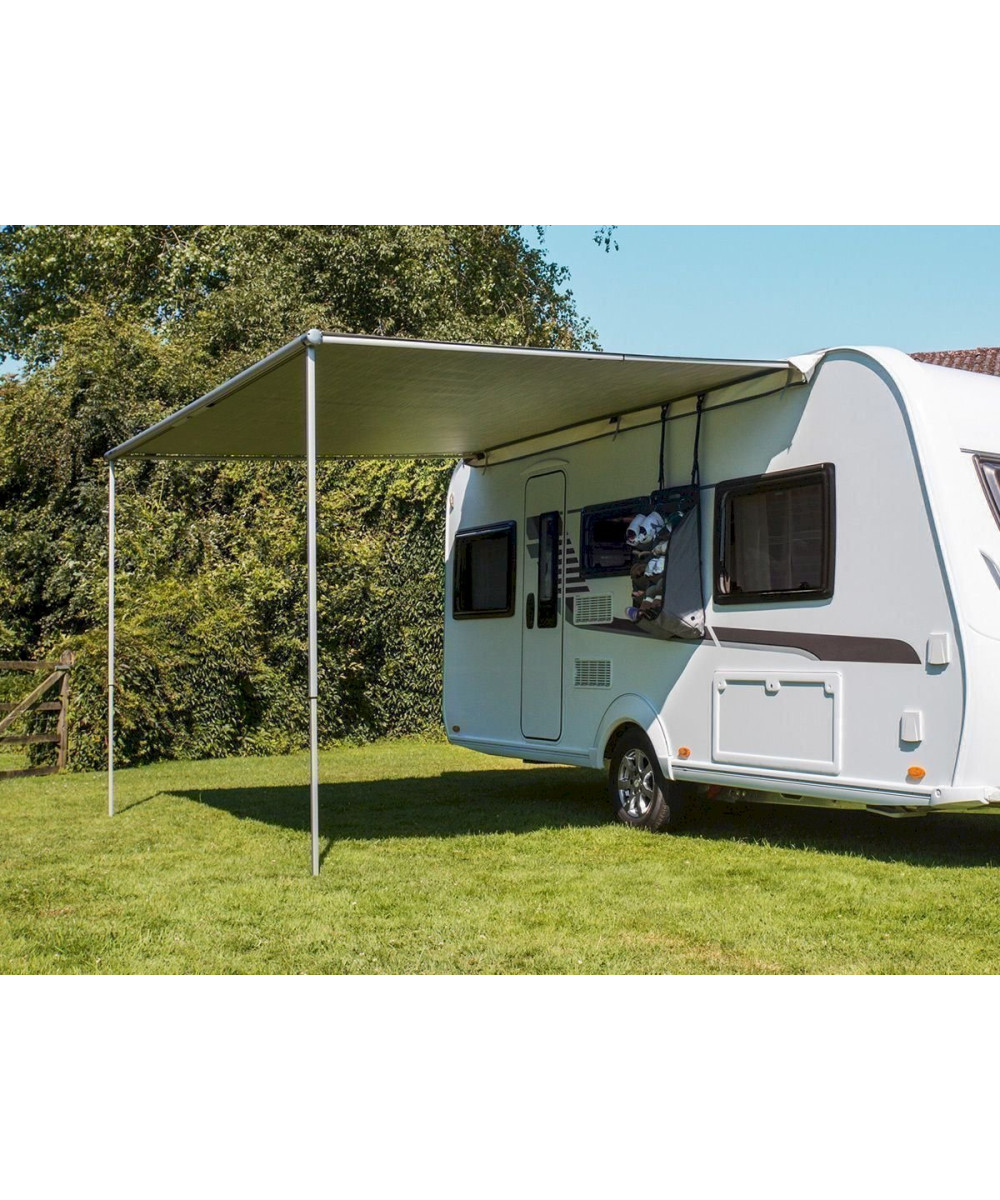 Ein integriertes Support Kit verteilt den Druck der Spannarme sicher auf die Wohnwagenwand. Befestigt ist alles in der kompakten Tasche. Bohrungen am Fahrzeug sind nicht erforderlich.
