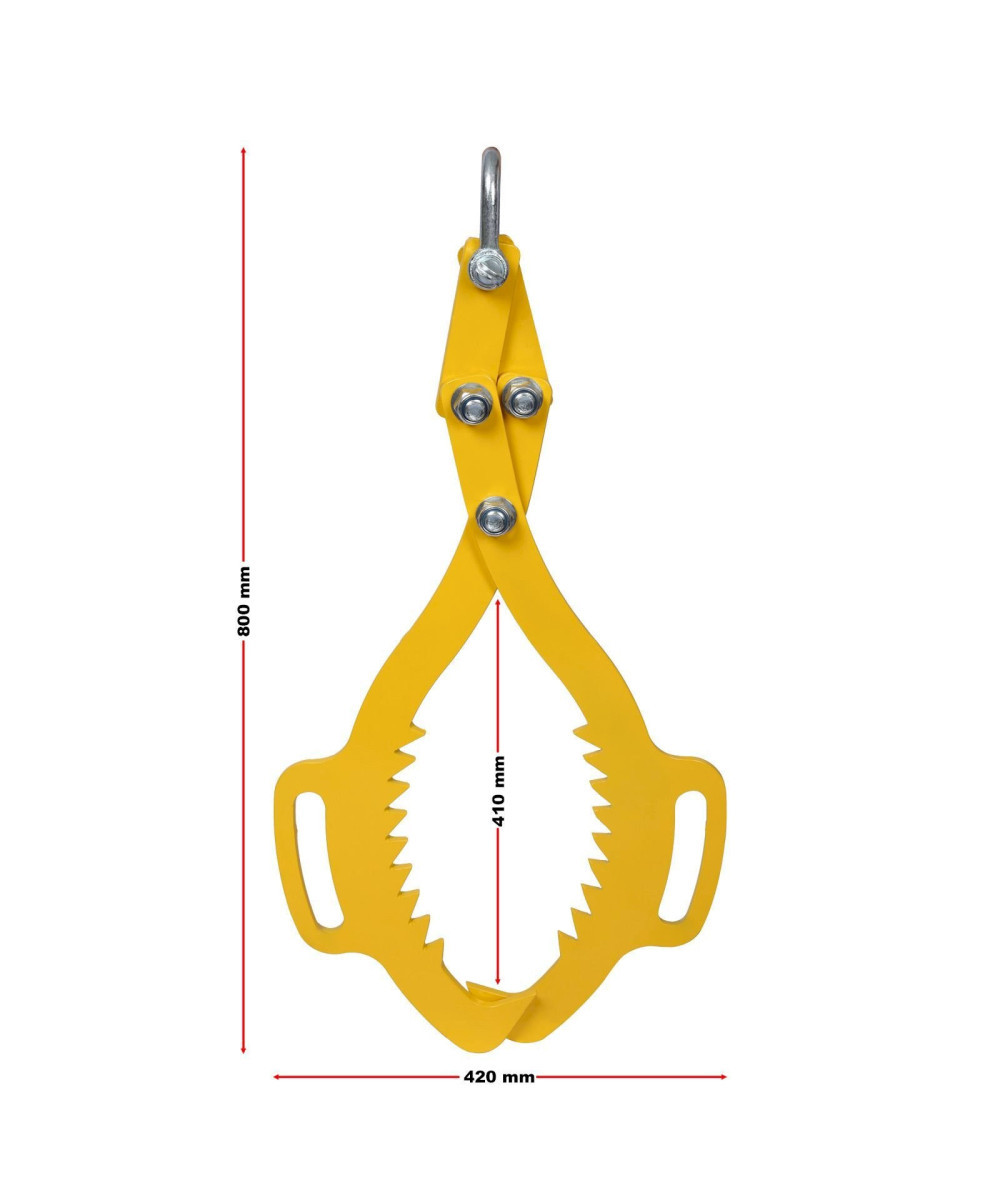 Die Forstzange ist mit vielen kleineren Haken ausgestattet, die den Baumstamm sicher greifen. Die Backenöffnung kann Stämme bis zu Ø 620 mm packen. Die Konstruktion ist sehr stabil und kann Holz bis zu einer Last von 1000 kg heben.