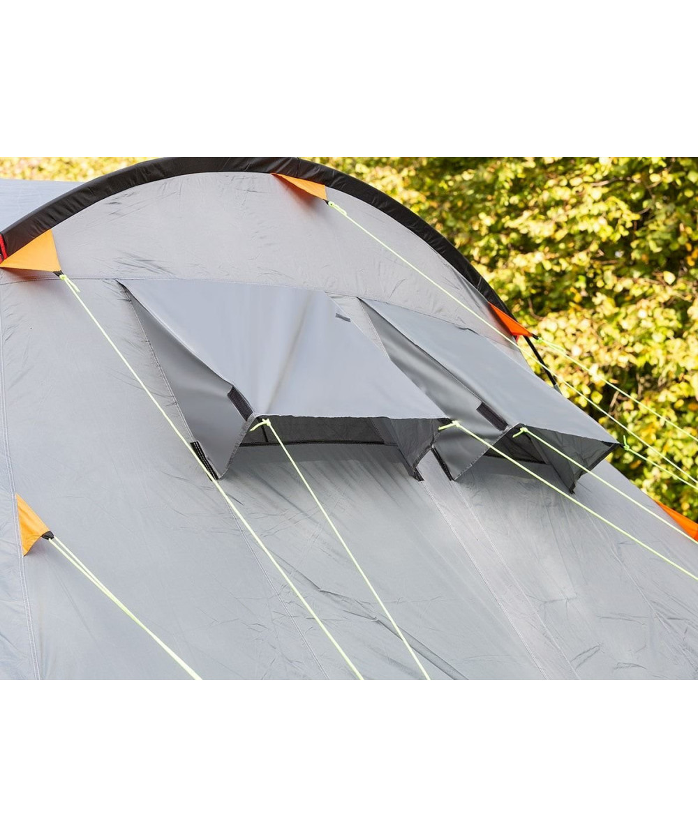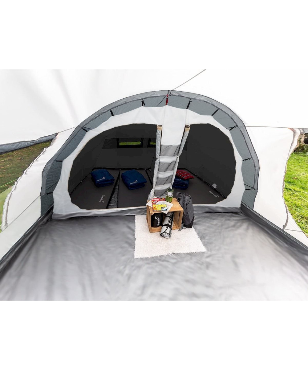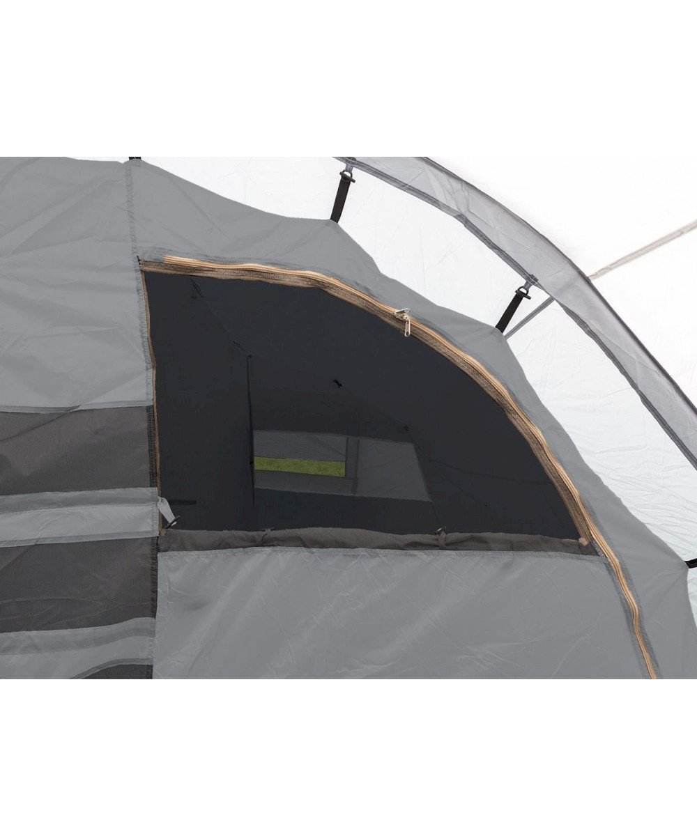 Im hinteren Bereich des Zeltes befindet sich eine großzügige 215 x 340 cm große Schlafkabine für bis zu 5 Personen, mit einer Trennwand (für 1 oder 2 Schlafbereiche). Das Außenzelt ist ein dunkelgraues, UV-beständiges, 185T Polyester mit einer Wassersäule von 5.000 mm. Die Schlafkabine im Inneren ist mit Moskitonetz ausgestattet und besteht aus atmungsaktivem Polyester.
