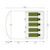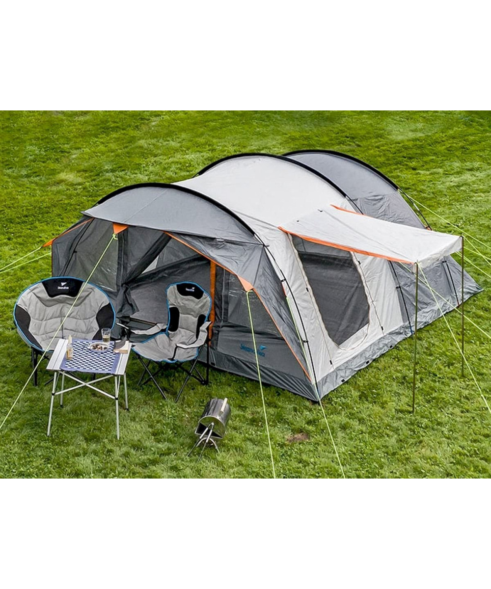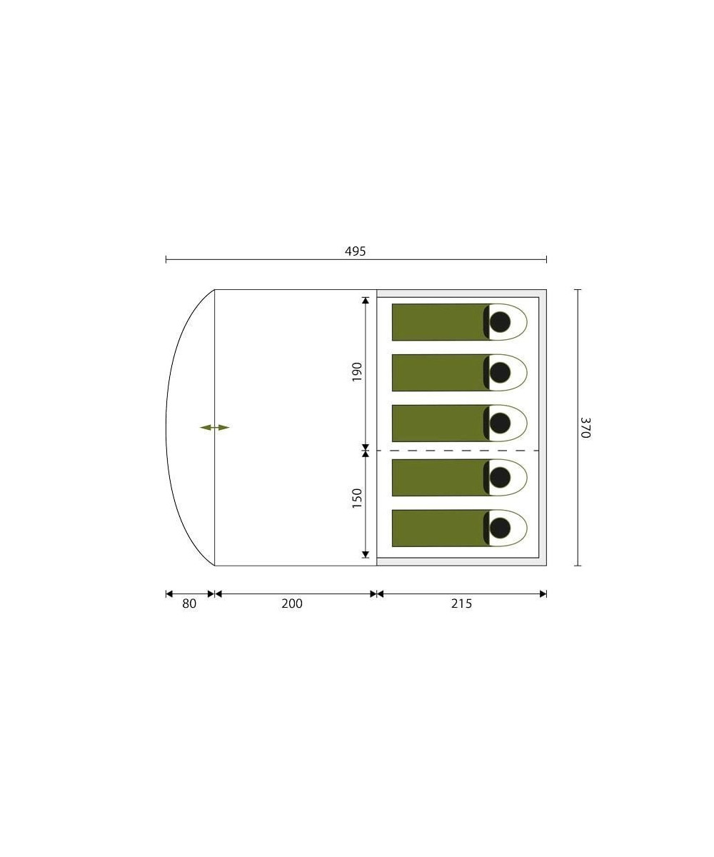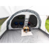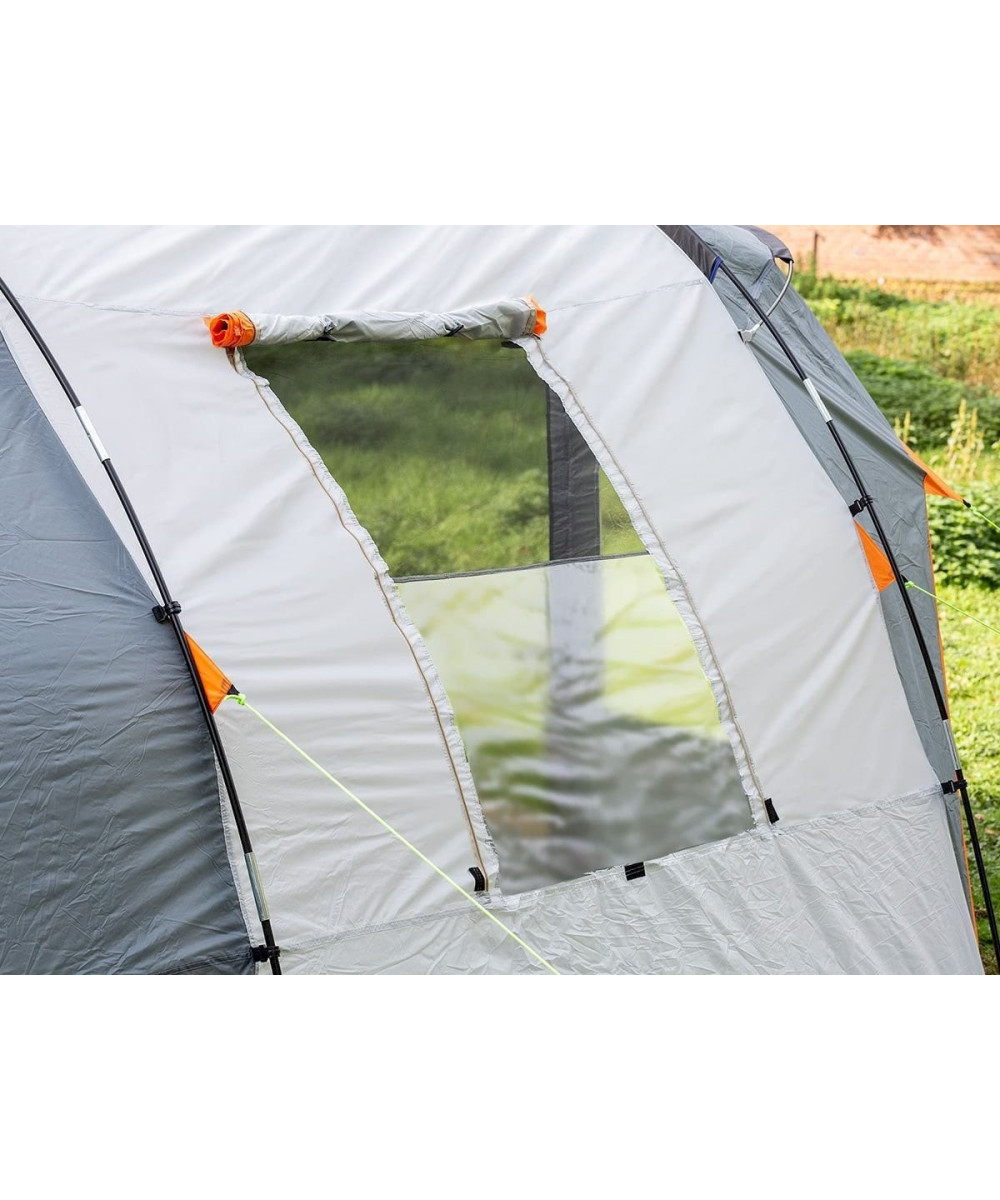 Im hinteren Bereich des Zeltes befindet sich eine großzügige 215 x 340 cm große Schlafkabine für bis zu 5 Personen, mit einer Trennwand (für 1 oder 2 Schlafbereiche). Das Außenzelt ist ein dunkelgraues, UV-beständiges, 185T Polyester mit einer Wassersäule von 5.000 mm. Die Schlafkabine im Inneren ist mit Moskitonetz ausgestattet und besteht aus atmungsaktivem Polyester.