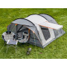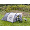 Die große Wohnfläche von 200 x 370 cm (200 cm Stehhöhe) bietet viel Platz für zusätzliche Gäste und einen gemütlichen Raum zum Entspannen an kühleren Abenden. Die großen Fenster sorgen für viel natürliches Licht und alle sind mit einer von innen verstellbarer Verdunkelung ausgestattet. Ein großzügiges Seitenfenster befindet sich direkt gegenüber dem großen Seiteneingang, beide mit Moskitonetz, und ermöglicht somit eine freie Luftbewegung. Organizertaschen und Laternenhaken sind im Lieferumfang enthalten.