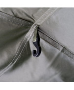 Das Anglerzelt besteht aus 210D Polyester, hat eine 2000 mm Wassersäule und ist PU-beschichtet, sodass der Zeltstoff wasserabweisend ist. Der fest vernähte Boden besteht aus PVC, welches den Boden feuchtigkeitsbeständig und rutschfest macht.