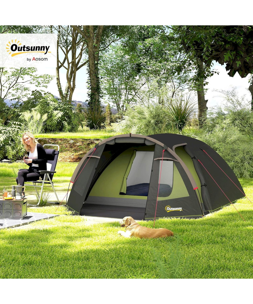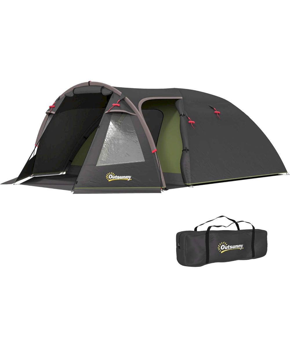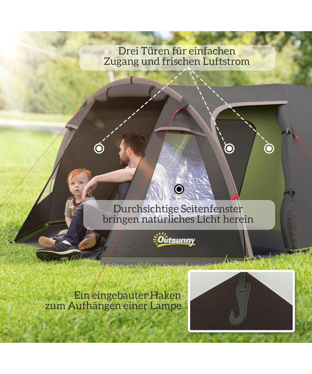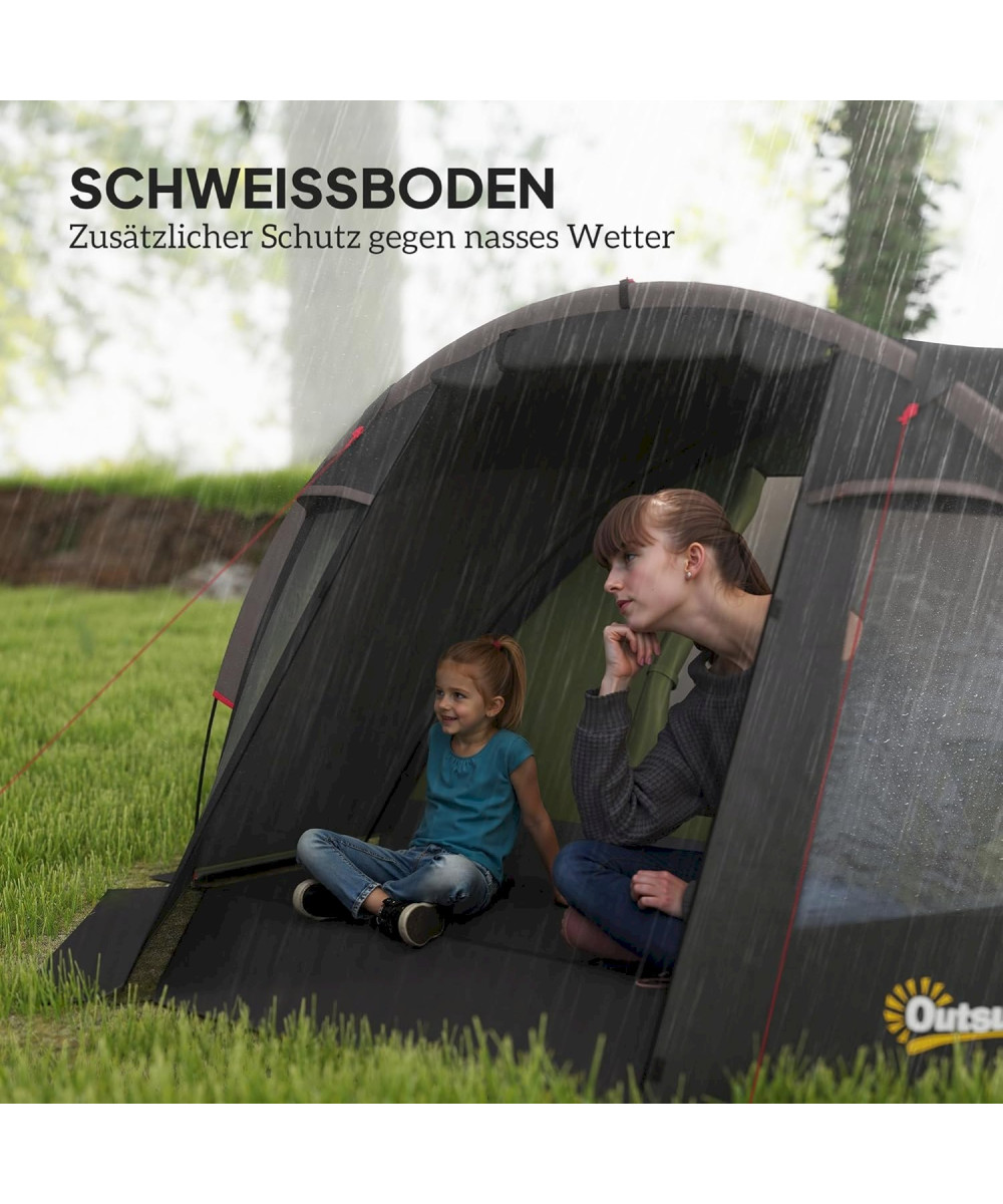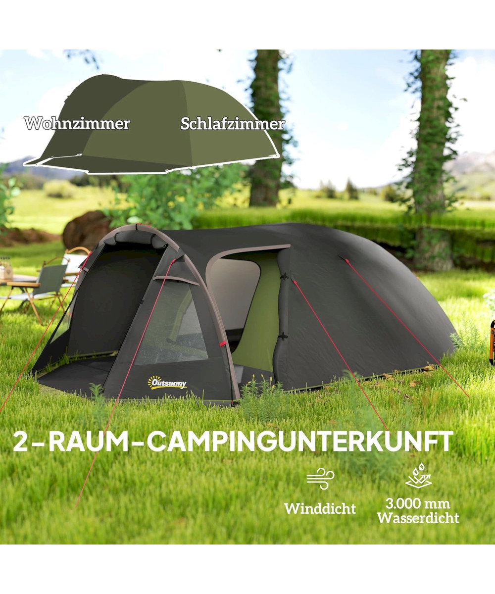 Erleben Sie die Natur mit dem Outsunny Tunnelzelt, einem weitläufigen, wasserdichten Campingzelt für 4 Personen, das auf Komfort ausgelegt ist. Dieses Familienzelt teilt Wohn- und Schlafbereiche intelligent auf, hergestellt aus 190T Polyester für höchste Wasserresistenz. Doppeltüren ermöglichen bequemen Eintritt und durch die Seitenfenster genießen Sie gemütliche Nächte unter Sternenlicht – ideal für Camping mit der Familie und Backpacking-Abenteuer!