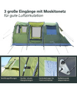 Viel Flexibilität bietet dieses Zelt mit den drei Eingängen, die alle mit Moskitonetz versehen sind. Mit den 2 mitgelieferten Aufstellstangen lässt sich jeweils eine der beiden Seitentüren in ein schattenspendendes Sonnendach umwandeln.