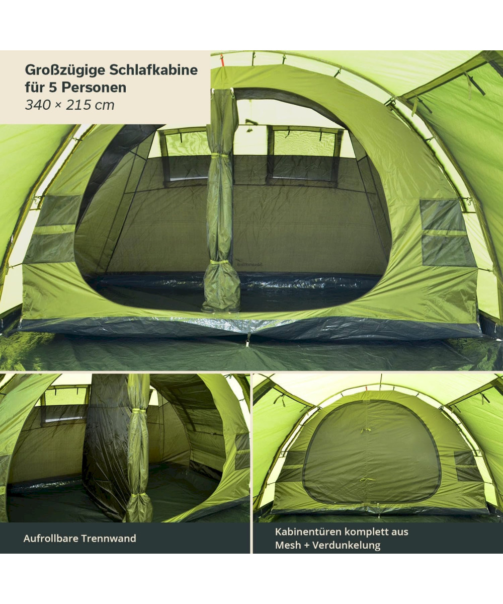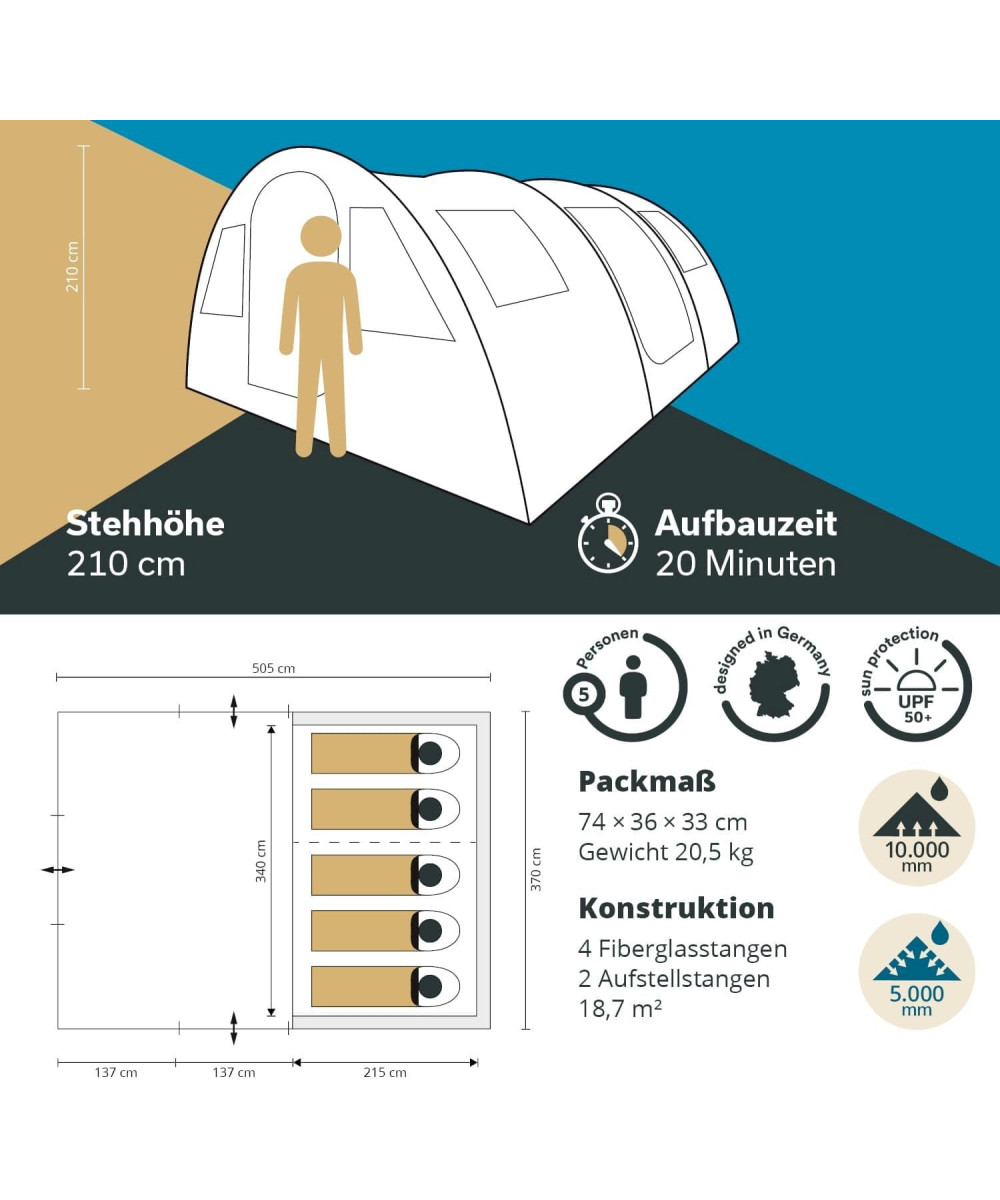 - Gesamtgröße 505 × 370 cm/Kabine 215 × 340 cm/Packmaß 74 × 36 × 33 cm/Gewicht 20,5 kg