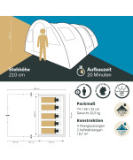Dieses großzügige Zelt bietet über 18 m² Wohnraum mit fest eingenähtem Zeltboden bei einer durchaus bequemen Stehhöhe von 210 cm. Es ermöglicht somit fantastische Outdoor-Abenteuer für Familien und Freunde, die schnell und unproblematisch ihr Urlaubsquartier aufstellen möchten.