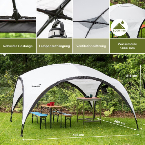 Der Pavillon bietet Schutz vor UV-Strahlen und hält mit der Wassersäule von 1.000 mm leichten Regen ab. An der Spitze des Pavillons befinden sich Lüftungsschlitze, die den Pavillon auch weniger anfällig für Wind macht. Für Stabilität sorgen die robusten 19 mm Stahlstangen, die Abspannseile und die Bodenheringe, die die Standfüße im Boden verankern.