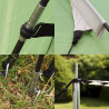 Der Zeltaufbau gestaltet sich einfach, die Fiberglasstangen in die Ösen einführen, Aufstellstangen platzieren, die Abspannseile mit den Erdnägeln fixieren und schon steht das Zelt.