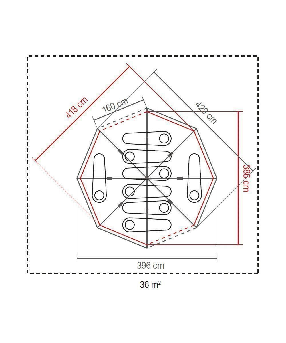 - Außenzelt: Polyester, PU überzogen, feuerhemmend