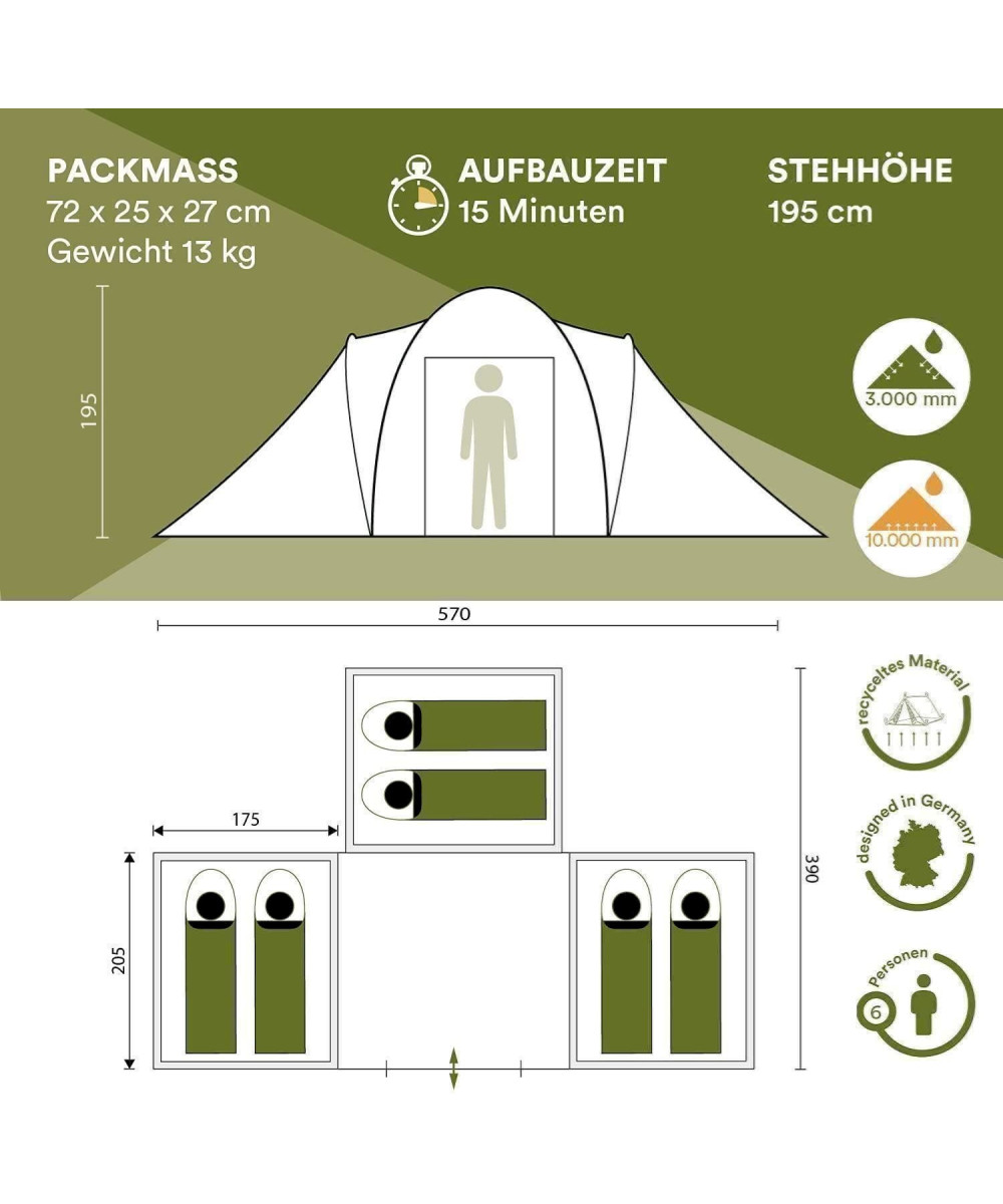 - GERÄUMIG Das große 6-Personen Campingzelt ist der perfekte Begleiter in einem Campingurlaub mit Familie oder Festival mit Freunden. Der Wohnraum bietet viel Platz für Gepäck oder Campingmöbel.