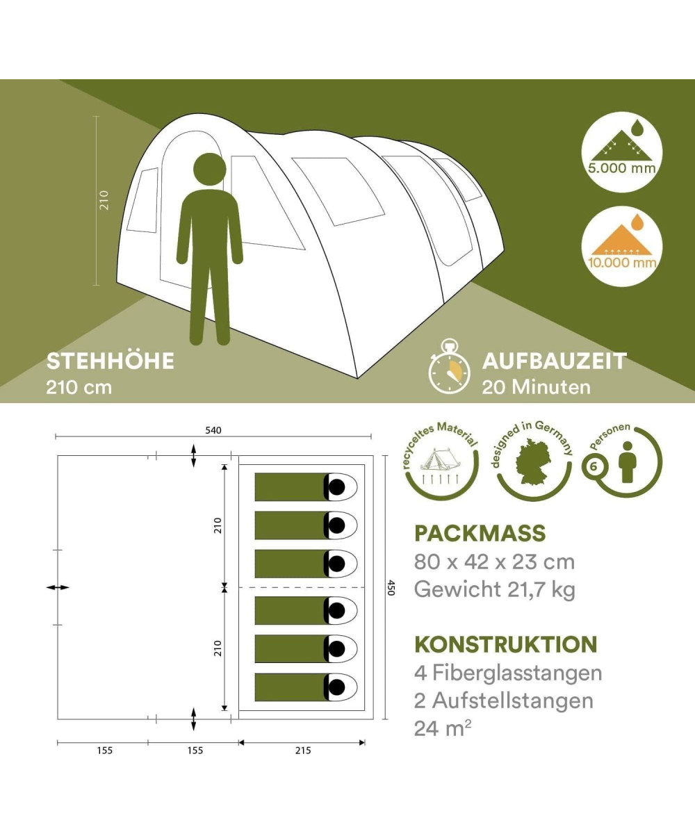 Das Zelt bietet eine über 24 m große Fläche, wovon allein über 13 m als Wohnraumgenutzt werden können, selbst mit eingehängter Schlafkabine, und dass bei einer bequemen Stehhöhe von 210 cm. Der fest eingenähte Zeltboden bietet perfekten Rundumschutz und das clevere Design Flexibilität für verschiedenste Anforderungen.
