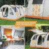 Ein großer Pluspunkt in der Flexibilität dieses Zeltes sind die drei Eingänge, die alle mit Moskitonetz versehen sind. Mit den 2 mitgelieferten Aufstellstangen lässt sich jeweils eine der beiden Seitentüren in ein schattenspendendes Sonnendach umwandeln – je nach Tageszeit und Ausrichtung der Sonne. Zwei mit Moskitonetz versehene Fenster und zwei Folienfenster im Wohnbereich sorgen für viel Tageslicht, damit es selbst bei geschlossenen Türen im Zeltinneren angenehm hell und freundlich ist. Alle Fenster können bei Bedarf abgedunkelt werden.