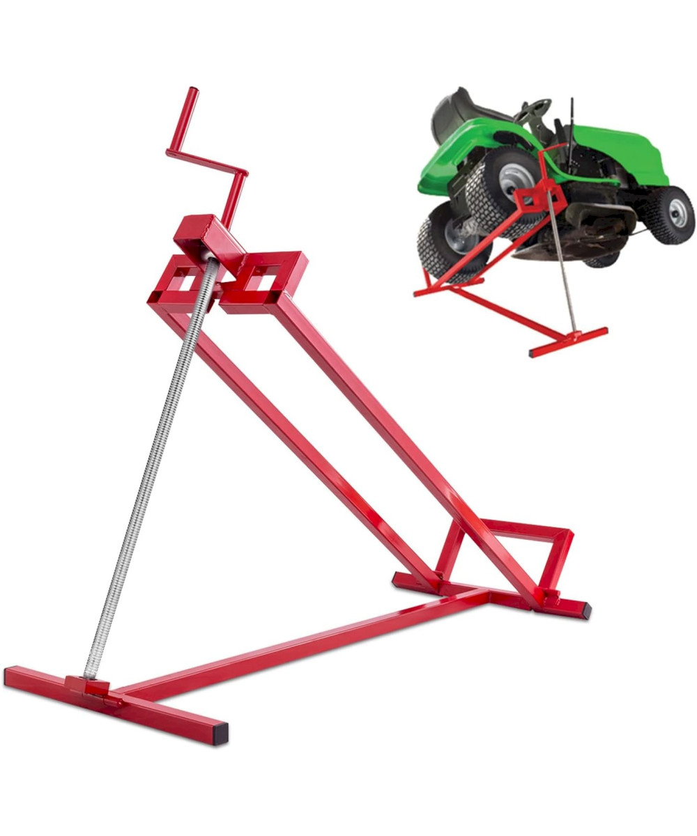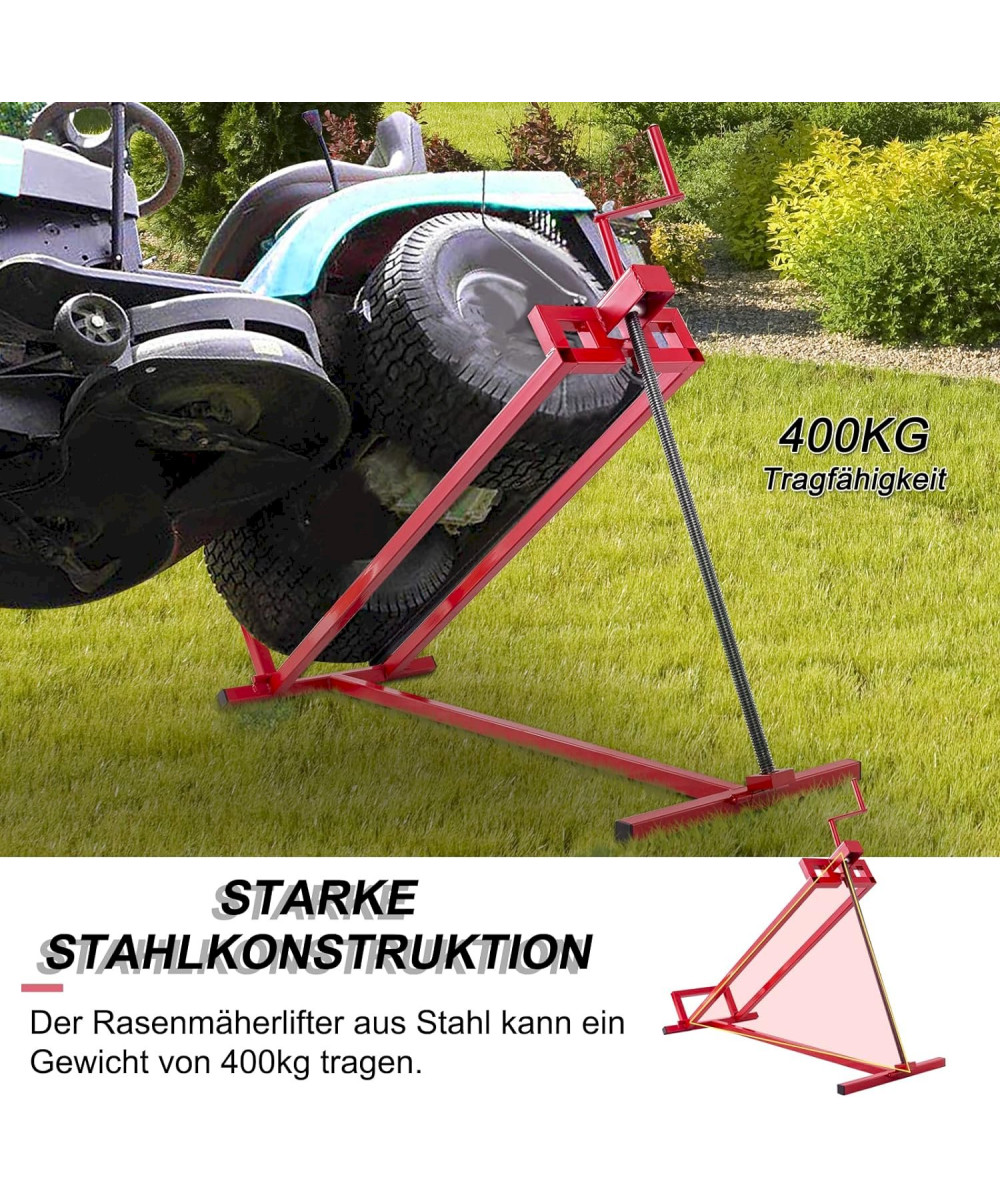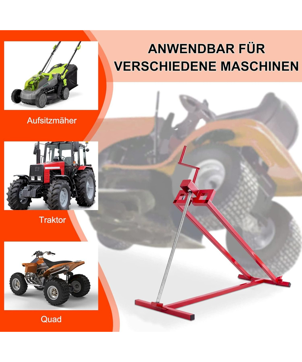 Der Rasentraktorheber ist die ideale Universal-Hebevorrichtung zum Aufbocken von Kleintraktoren, Aufsitzmäher, Quads sowie für alle Arten von Rasenmähern. Dieser Rasentraktor-Heber macht Ihnen die schwere Arbeit richtig leicht! So können Sie die Reinigung an der Unterseite von Mähern, Kleintraktoren, Quads & Co. schnell durchführen. Sie fahren einfach mit den Rädern auf den Heber und kurbeln ihn hoch. Der Neigungswinkel ist bis ca. 60° stufenlos verstellbar und bietet einen sicheren Stand. Auf diese Weise sind bodenseitige Anbauteile bequem erreichbar. Damit bekommen Sie schwere Rasenmäher, Quads und leichte Traktoren problemlos in den Griff!