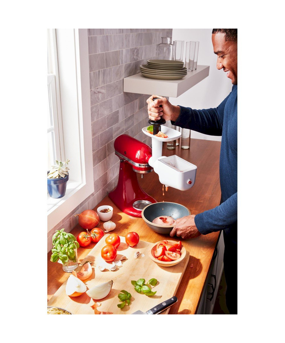Sie können unseren KitchenAid Pürieraufsatz zusammen mit unserem KitchenAid Fleischwolf (separat erhältlich) verwenden, um leckere sämige Speisen zu kreieren. Experimentieren Sie mit Ihren Lieblingszutaten, um eigene Marmeladen, Pürees, Saucen, Kompotte oder Babynahrung zuzubereiten. Die Stromversorgung des Aufsatzes erfolgt über Ihre KitchenAid Küchenmaschine, sodass Obst und Gemüse mühelos püriert werden können. Der Pürieraufsatz wird in Kombination mit dem Fleischwolf verwendet, wobei Letzterer zunächst die Zutaten zerkleinert. Anschließend sorgt das Kegelsieb dafür, dass alle Schalen, Stiele oder Rinden entfernt werden, sodass Sie eine glatte Konsistenz erzielen. Der Aufsatz kann zum Pürieren von Tomaten, Zitronen und vielen anderen Zutaten verwendet werden. Befestigen Sie einfach das Kegelsieb, den Siebkorb und den Spritzschutz an Ihrem KitchenAid Fleischwolf (separat erhältlich), um weiches Obst und gekochtes Gemüse zu verarbeiten. Schälen oder Entkernen ist nicht erforderlich. Legen Sie das Obst oder Gemüse einfach in den Trichter und stellen Sie mit dem KitchenAid Pürieraufsatz ein hochwertiges Püree her. Der Aufsatz ist spülmaschinengeeignet und damit leicht zu reinigen. Welches Rezept probieren Sie als Erstes aus?