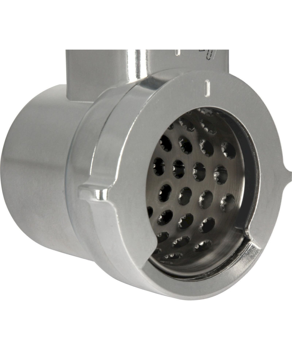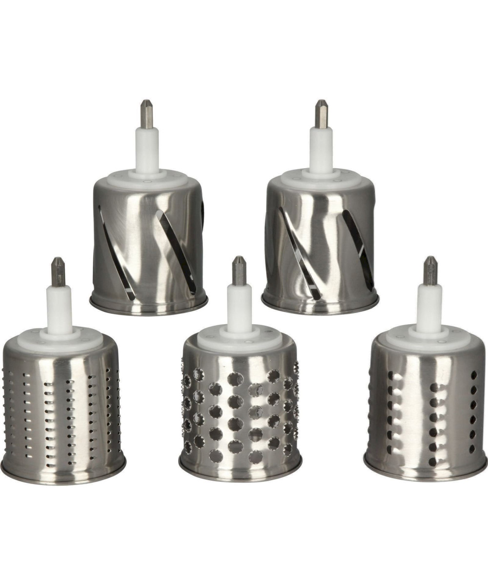 Die aus hochwertigem Metall gefertigte KAX643ME Trommelraffel ist passend für viele Modelle der Kenwood Küchenmaschinen und wird am Niedrigdrehzahlanschluss angebracht. Je nachdem, welche Lebensmittel, wie grob oder fein verarbeitet werden sollen, stehen fünf verschiedene Einsatztrommeln zur Auswahl, die sich für grobes und feines Reiben, für grobes und feines Schneiden und zum Kartoffeln reiben eignen.