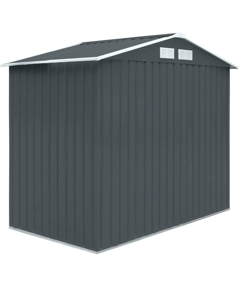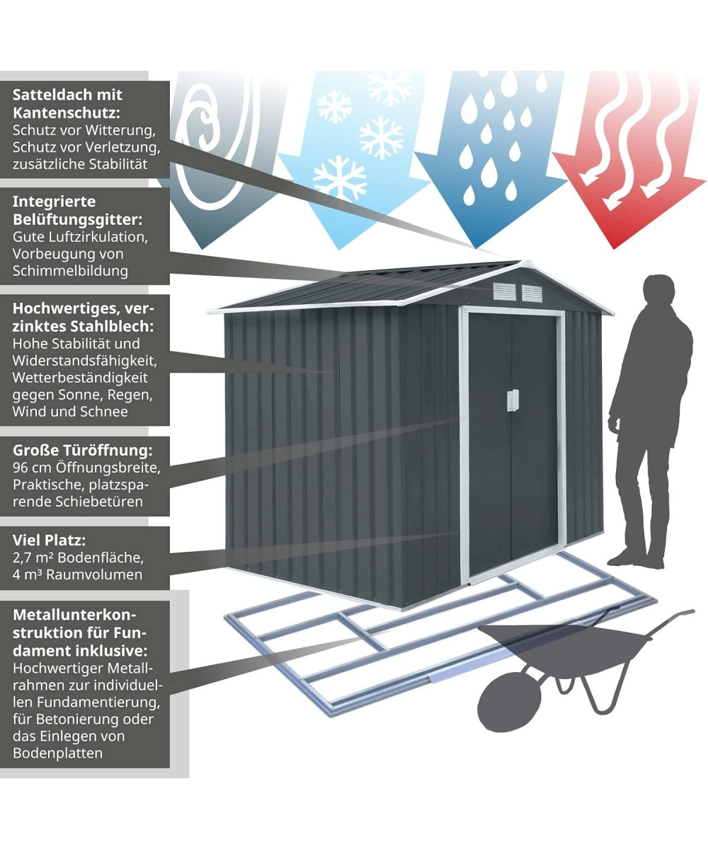 L'abri est fabriqué en tôle d'acier galvanisée et laquée. tôle d'acier et présente un design intemporel. Le cadre fourni cadre de fondation en métal offre une stabilité et une assise sûre - vous avez ici la possibilité d'insérer un plancher (plaques de sol non comprises dans la livraison). La forme du toit permet aux précipitations de s'écouler sans problème. L'abri de jardin est facile à nettoyer et ne nécessite aucun entretien.