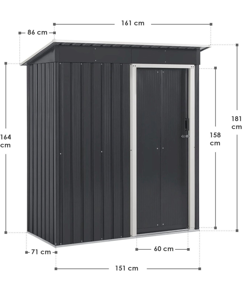 Mit dem modern gehaltenen Metall Gerätehaus S mit Pultdach in Grau sorgst du stilvoll für Ordnung im Garten oder auf der Terrasse. Verstaue hier ganzjährig Werkzeuge, Gartengeräte oder Spielzeug sauber und trocken. Das kompakte Metallgerätehaus in 161 x 86 x 181 cm (Breite x Tiefe x Höhe) eignet sich ideal für den kleinen Garten am Reihenhaus. Aber auch im Schrebergarten oder beim Außenbereich auf dem Campingplatz erweist der Blechschuppen seine Dienste. Der Fundamentrahmen aus Stahl und die Werkzeughalterung runden die Ausstattung ab.