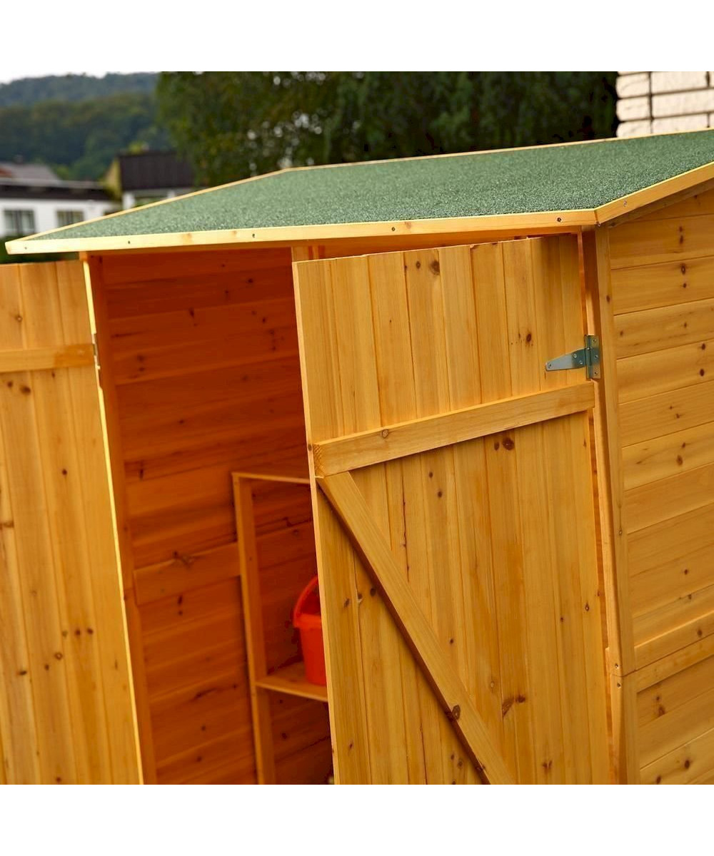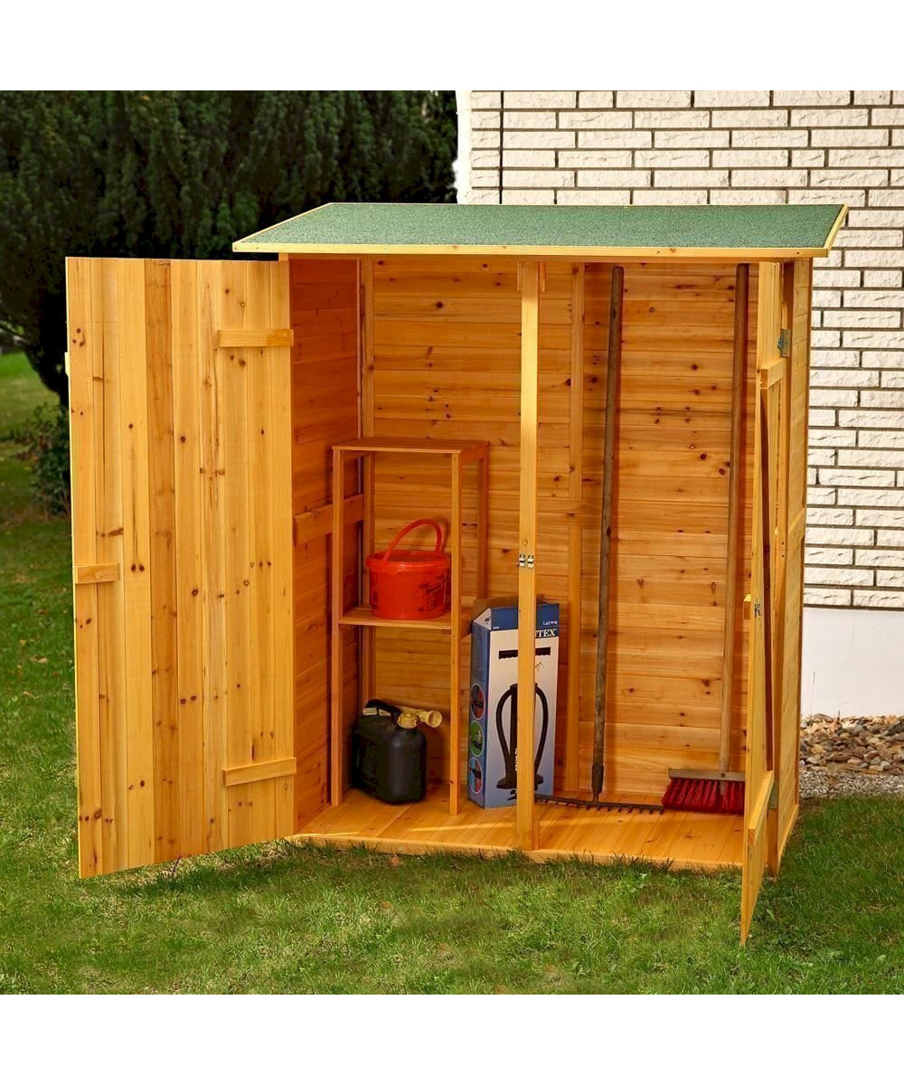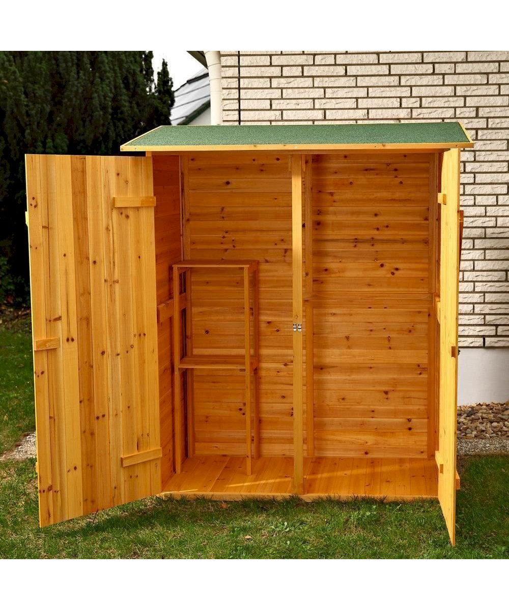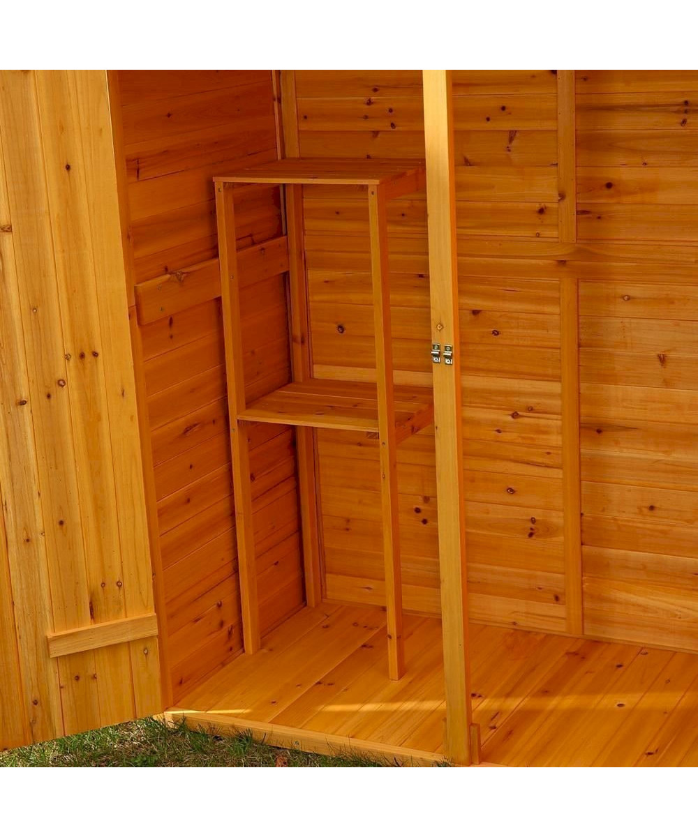 - L'abri de jardin en bois dispose d'un plancher et d'une porte à deux battants avec verrouillage coulissant, ce qui permet également de ranger facilement de grands outils de jardin dans l'abri de jardin. L'étagère à l'intérieur peut être utilisée comme étagère de rangement pour une pelle à poussière, des décorations de jardin, des pots de fleurs, etc. ou comme tabouret par exemple des fleurs. L'étagère en bois n'est pas solidement intégrée et peut être retirée pour créer une plus grande surface de rangement.