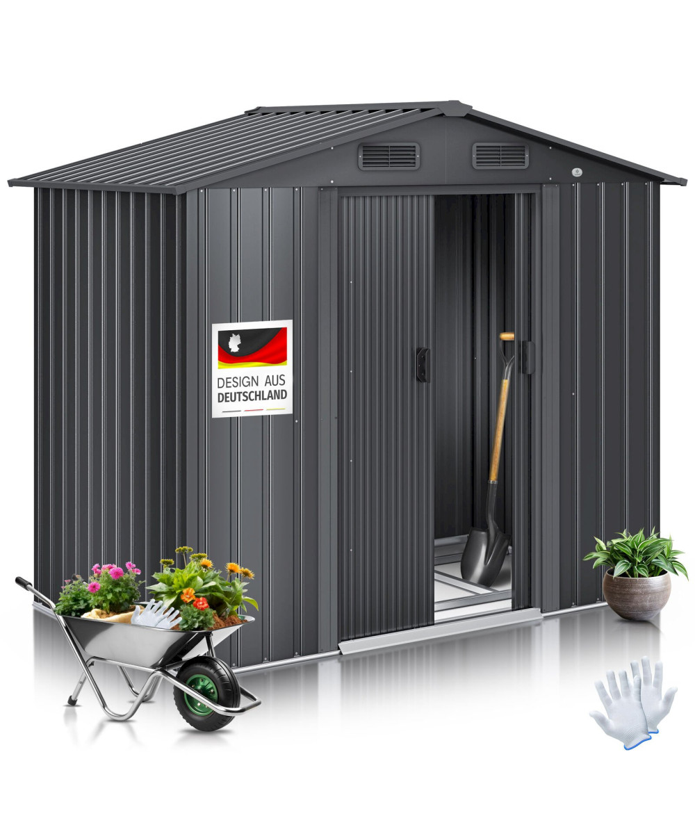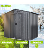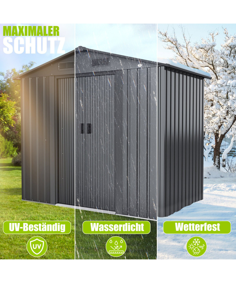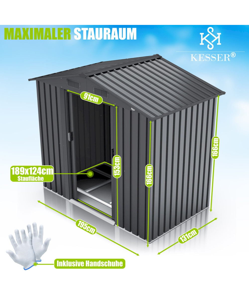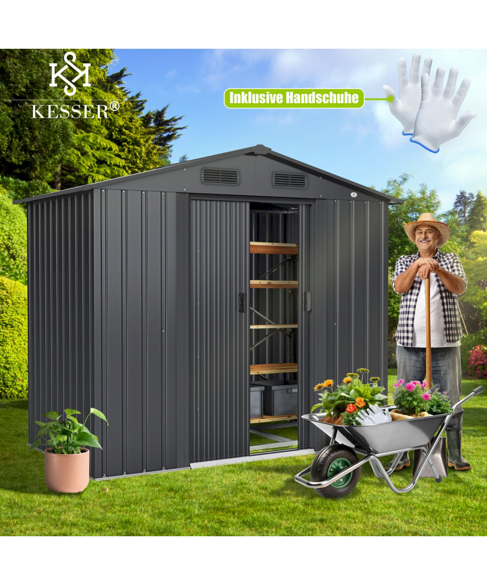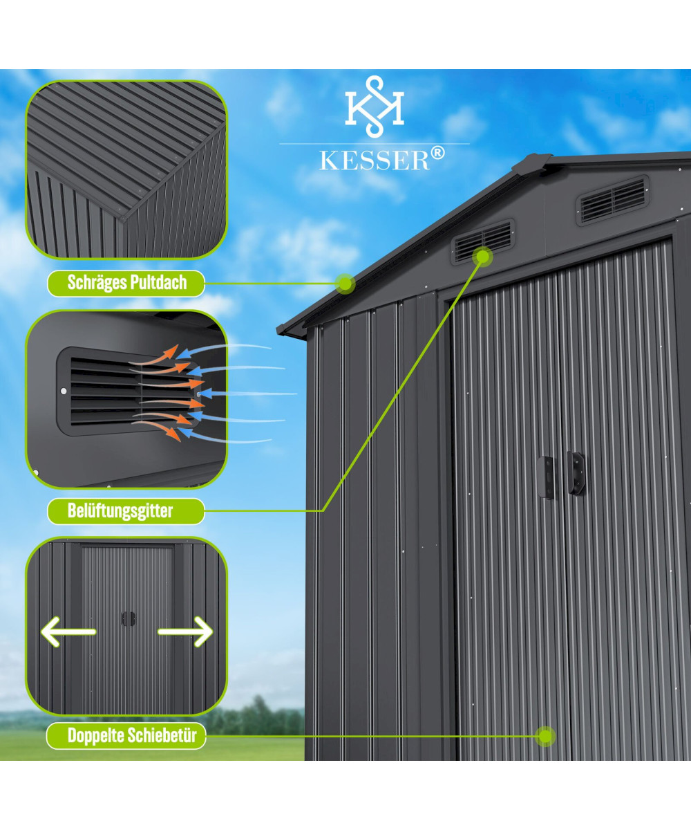 L'abri de jardin peut contenir des vélos, des outils, des tondeuses à gazon, des meubles de jardin, des pneus de voiture et d'autres objets. Il possède également une porte coulissante en deux parties, 4 ouvertures d'aération sur le dessus (2 à l'avant et à l'arrière).