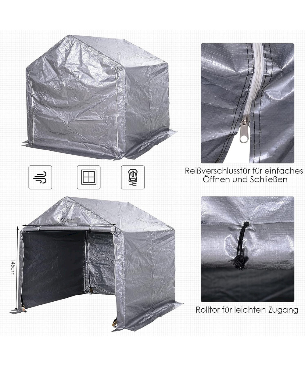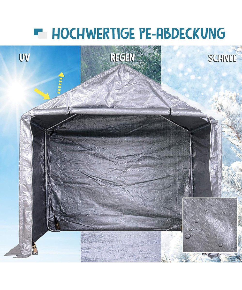 - Dotée d'une porte à enroulement facile à poser les jours de pluie ou de neige pour une meilleure protection