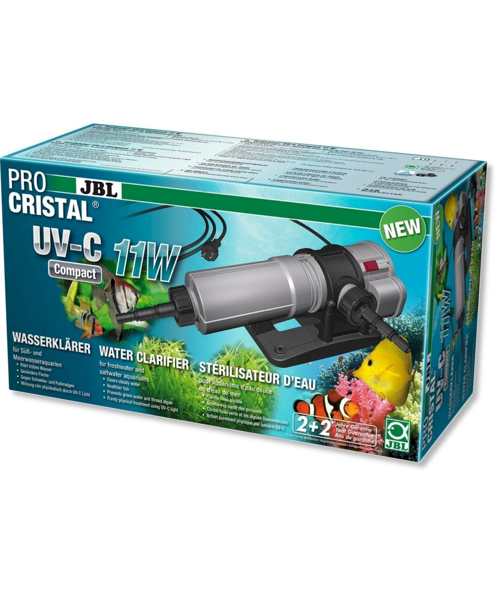 Stérilisateur UV JBL ProCristal 11w pour aquarium d'eau douce et d'eau de mer entre 200 et 1000 L. Nouvelle technologie plus compacte et toujours aussi efficace. 6039500 JBL Stérilisateur d'eau UV-C pour aquarium d'eau douce et d'eau de Mer. JBL ProCristal contre l'eau verte et l'eau blanchâtre. La filtration par rayonnement U.V. est un moyen efficace d'assainir son eau, sans traitement . Le rayonnement UV-C supprime rapidement les problèmes d'algues en suspension (eau verte) et les surcharges de bactéries (eau blanchâtre). Réduit également les germes et le risque d'infections sans effet secondaire. Efficace en Eau Douce et en Eau de Mer . Convient également pour un bassin de jardin . - Rayonnement plus efficace de + 50% par rapport à la gamme JBL AquaCristal, - Raccordement simple et rapide sur tuyaux souples ou rigides, - Arrêt de la lampe automatique et sécurisé lors de l'ouverture de l'appareil. Données techniques : Raccords à olive pour tuyau flexible 19 mm, Raccords à filetage pour tuyau rigide 1 1/2, Coude à 90° amovible, Câble caoutchouc robuste avec conducteur de protection, 4 ans de garantie sur le boîtier, LED de contrôle, Réflecteur intégré pour plus d'efficacité PROCRISTAL COMPACT UV-C 11 W Longueur totale : 36.5 cm, Stérilisation totale contre l'eau verte : Aquarium jusqu'à 200 litres (débit 200 à 500l/h), Stérilisation partielle de prévention et contre les germes : Aquarium jusqu'à 800 litres (débit 200 à 500l/h).