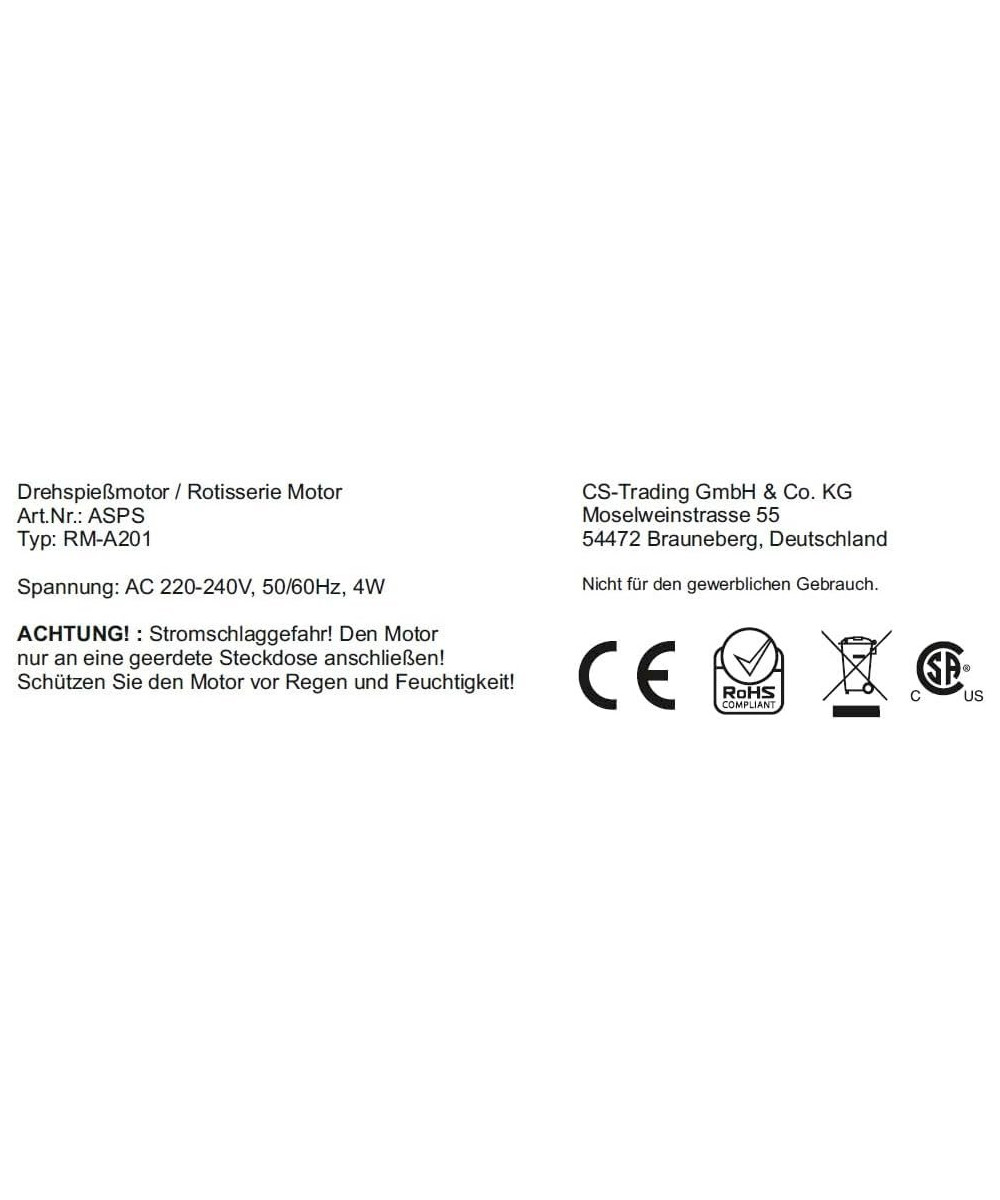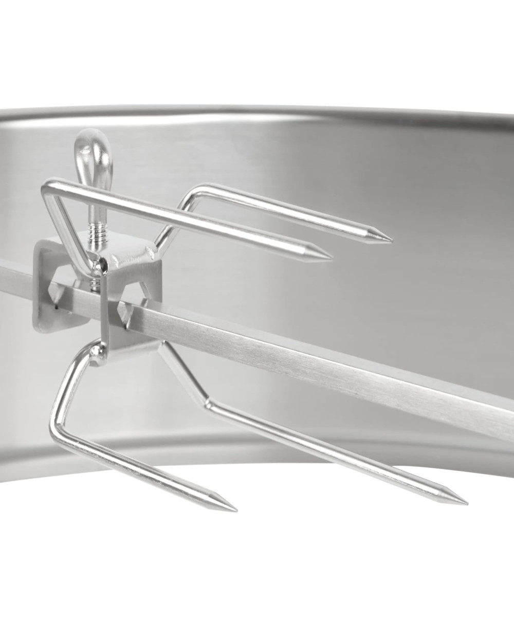 Der 60-cm-lange, massive 4-Kant-Grillspieß ist aus Edelstahl gefertigt. Der mitgelieferte Motor packt, gleichmäßg verteiltes Grillgut, bis zu ca. 10 kg. Mit ca. 2 - 3 Umdrehungen pro Minute wird Ihr Braten knusprig gegrillt und bleibt saftig.